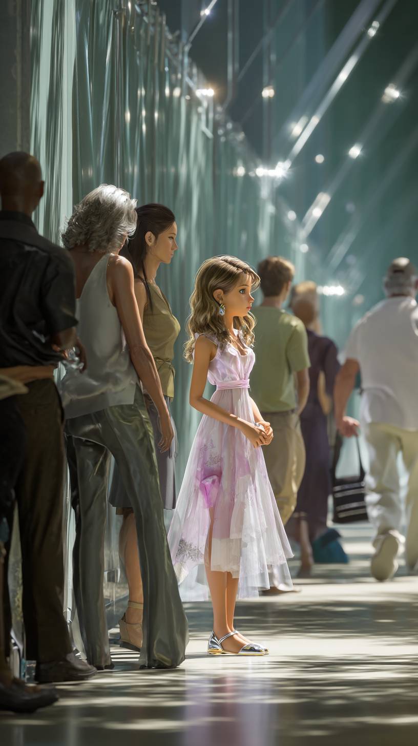 فتاة صغيرة بأسلوب بيكسار تقف بتوتر على رصيف مزدحم، محاطة بمشاة هائلين فائقين الواقعية.