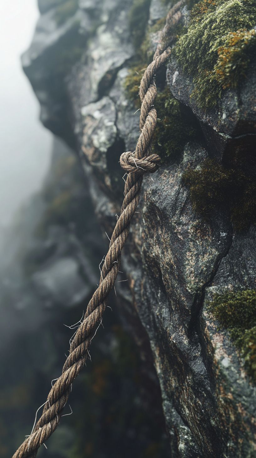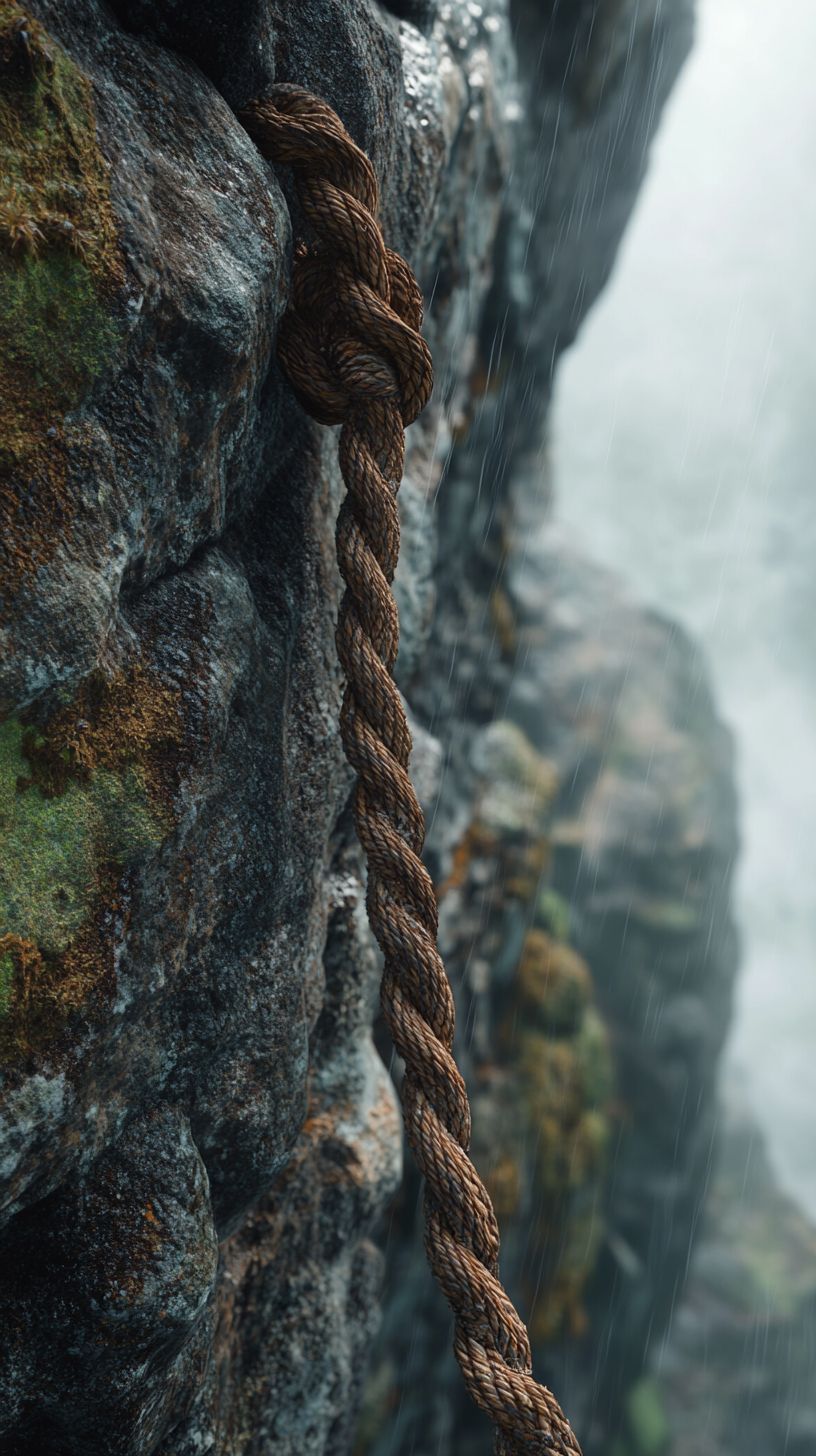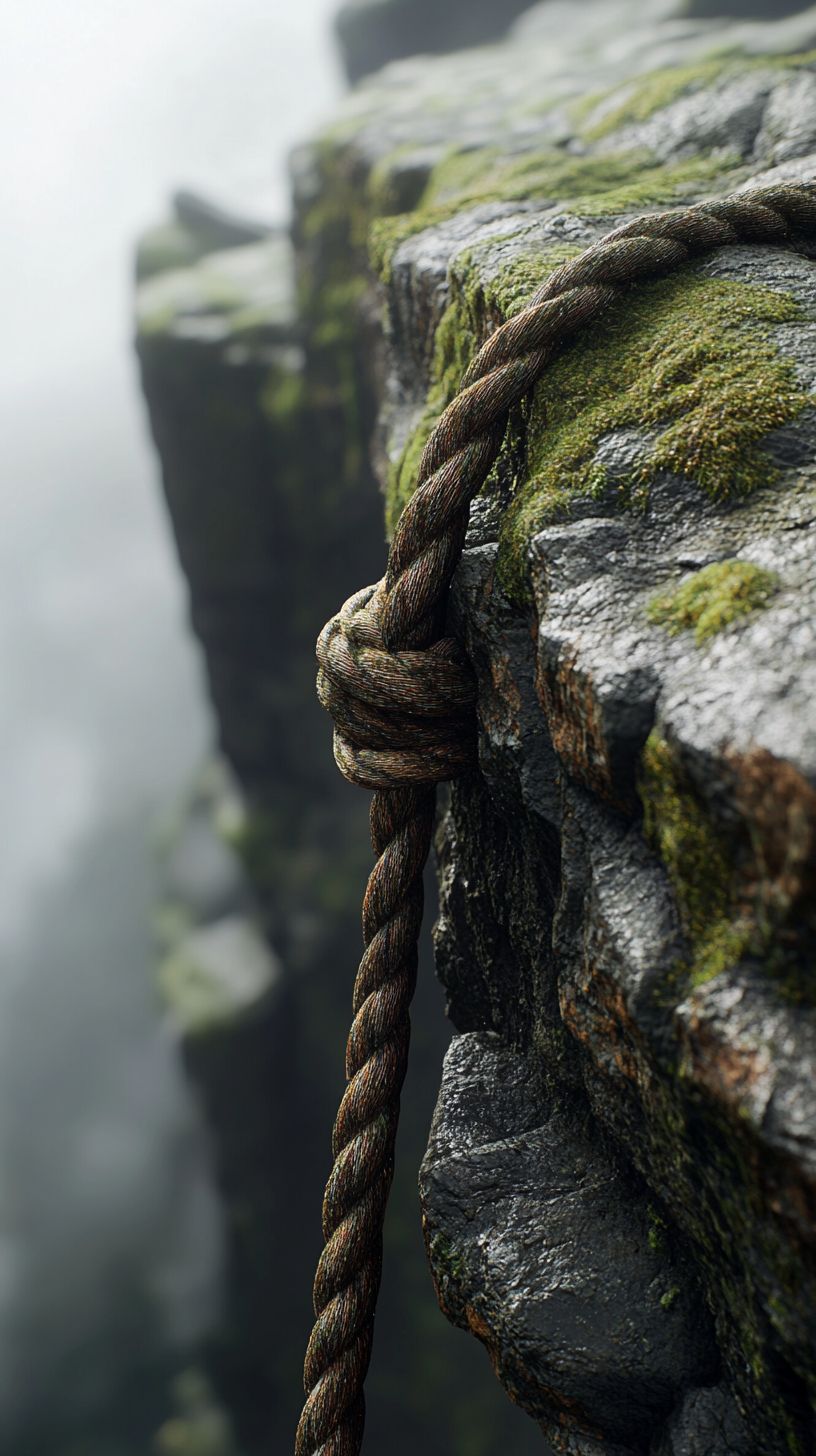 photo-realistic style, close-up shot of a broken hemp rope dangling from a cracks in a misty cliffside, the rope frayed and worn, fibers splitting and twisting naturally, rough moss-covered stone surface with fine cracks, tiny water droplets glistening on the rock, swirling fog around, cinematic and melancholic atmosphere, storytelling details, ultra high texture and realism, soft natural lighting, 8K, Canon EOS 5D Mark IV, 50mm lens --ar 9:16 --v 6.1