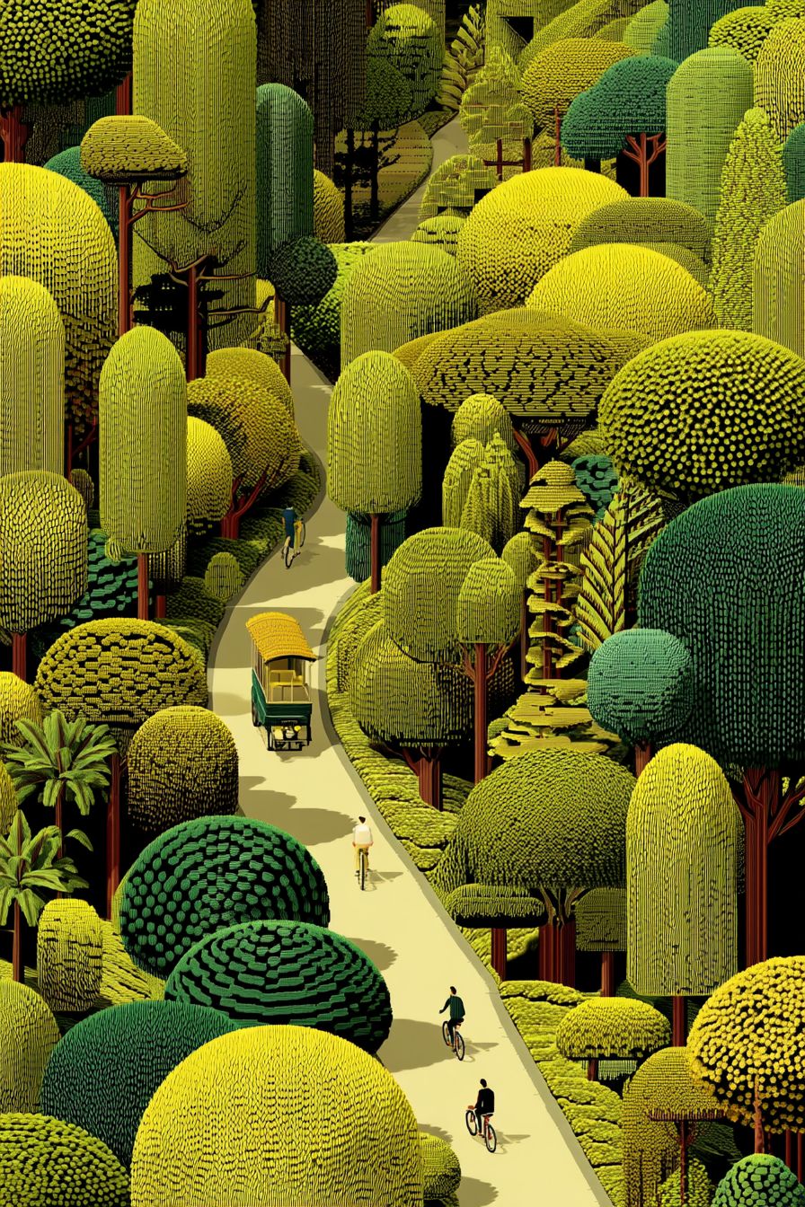 صورة سريالية لمسار الغابة. الأشجار على الجانبين كثيفة للغاية، مع مظلات مدورة وكثيفة، مبالغ فيها في الشكل ومرتبة بانتظام. تهيمن لوحة الألوان على الأخضر الساطع والحيوي. يتعرج مسار عبر الغابة، مع عدد قليل من الأشخاص الذين يركبون الدراجات ويمشون عليه، مما يضيف إحساسًا بالحجم والحياة. الإضاءة ناعمة، مع أشعة الشمس تتخلل الأشجار، مما يخلق جوًا حالماً وشفائيًا.