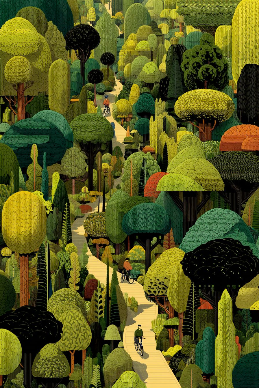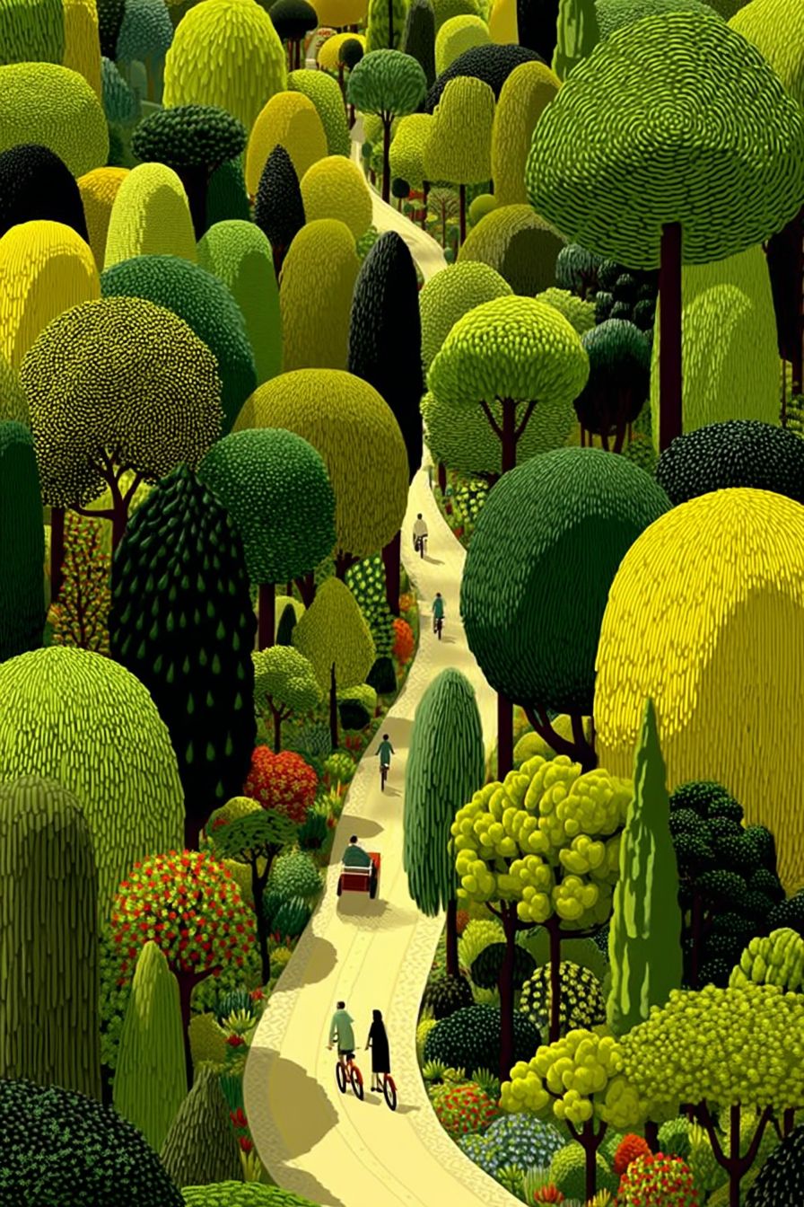 A surreal illustration of a forest path. The trees on both sides are extremely lush, with dense, rounded canopies, exaggerated in shape and arranged orderly. The color palette is dominated by bright, vivid greens. A winding path runs through the forest, with a few people riding bicycles and walking on it, adding a sense of scale and life. The lighting is soft, with sunlight filtering through the trees, creating a dreamy and healing atmosphere. --ar 2:3 --stylize 750 --v 7.0