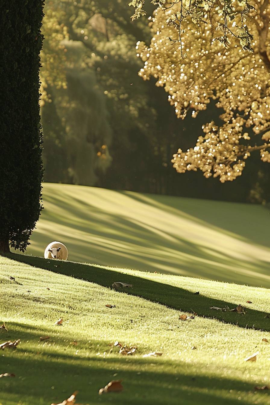A sheep in the distance on grass, areal view, photorealistic landscapes, minimalist backgrounds, striped arrangements, precise lines, linear perspective, shadows and dappled light --ar 2:3 --sref 1751306882 --stylize 300 --v 6.0