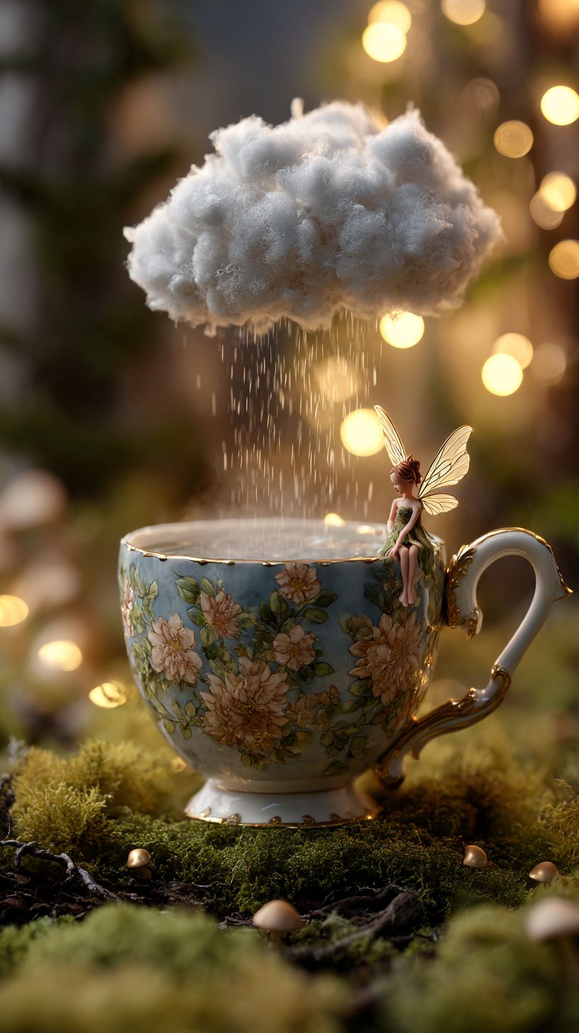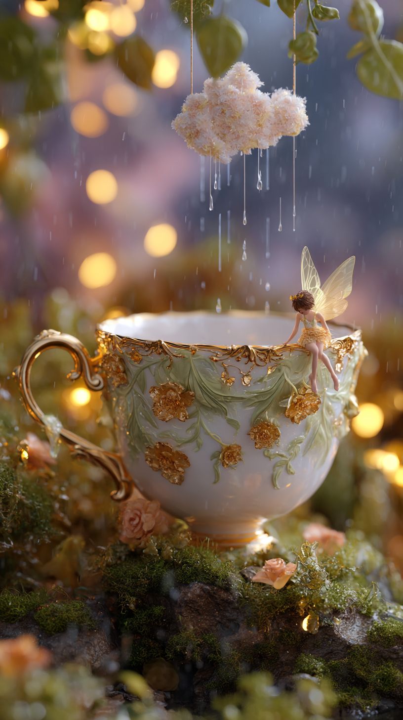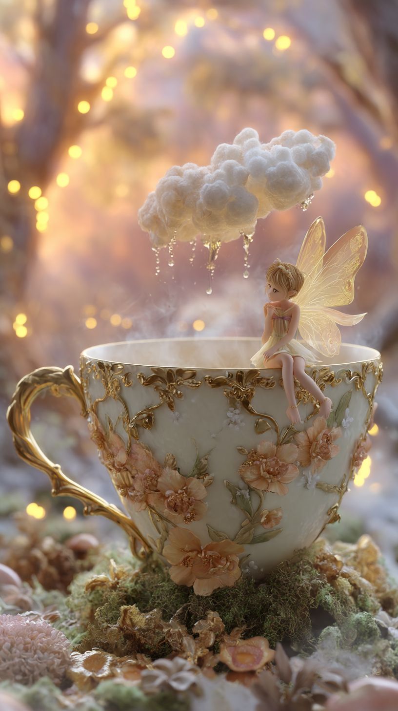 A detailed vertical fantasy scene: elegant porcelain teacup with golden floral detailing, a cotton-like miniature cloud floating right above it, raining into the cup. A charming fairy woman, small but clearly visible, sits beside the cup on moss, her wings glowing faintly, legs tucked to the side. Background: twilight forest glowing with warm fairy lights and drifting mist, soft light and dreamy colors. --ar 9:16 --v 7.0