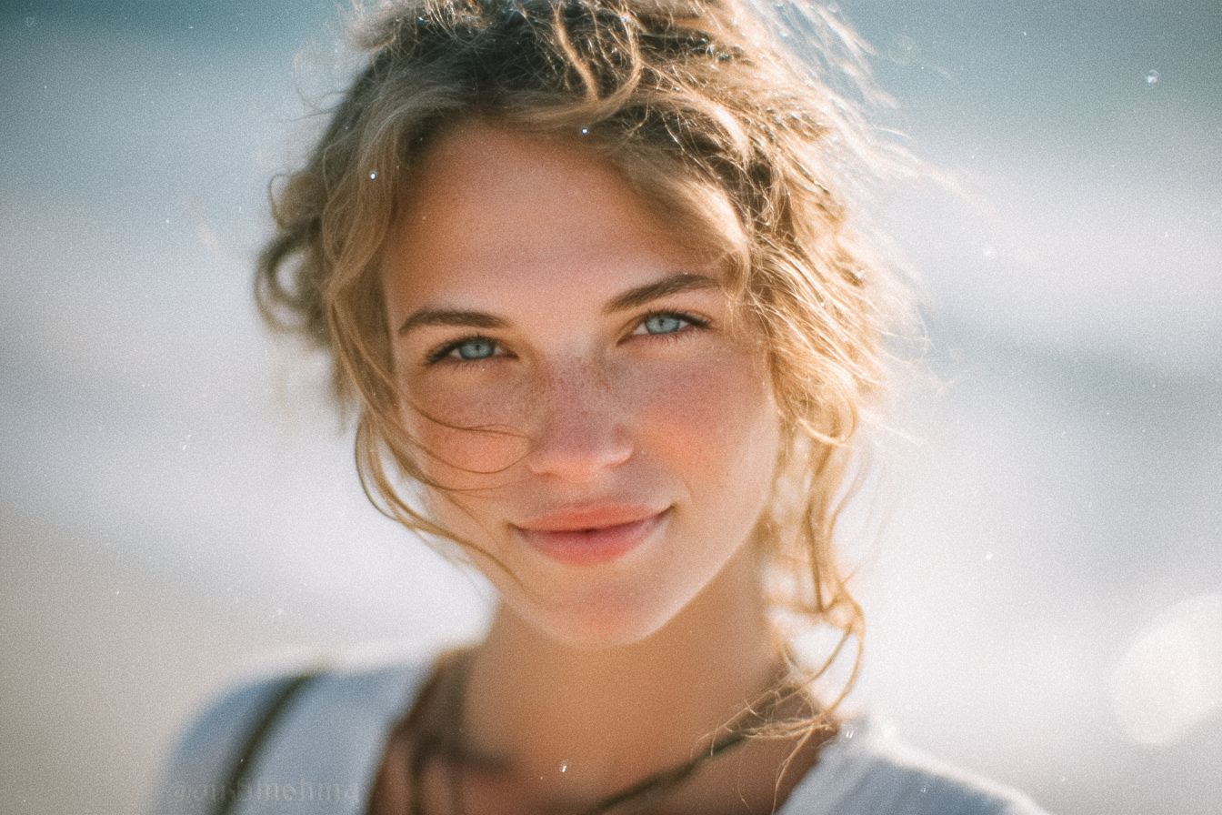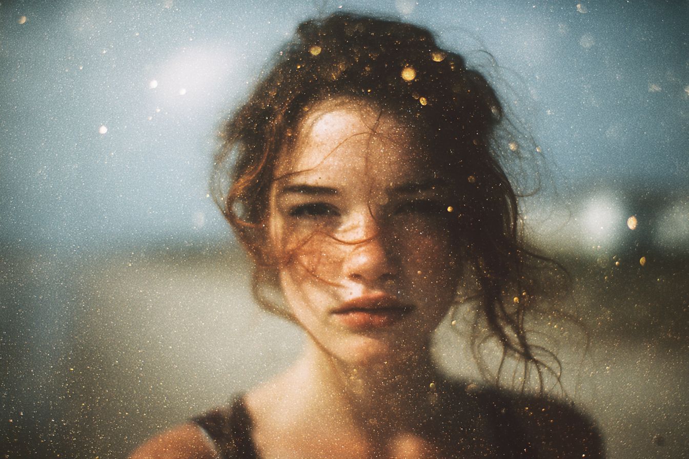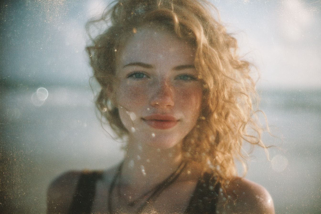 صورة شخصية عفوية على الشاطئ تم التقاطها باستخدام فيلم كوداك جولد 35 مم منتهي الصلاحية، مع تأثير طفو الماء، رمل الفيلم، حبيبات الفيلم، غبار الفيلم، وتسللات ضوء الشمس الفنية في الإطار.
