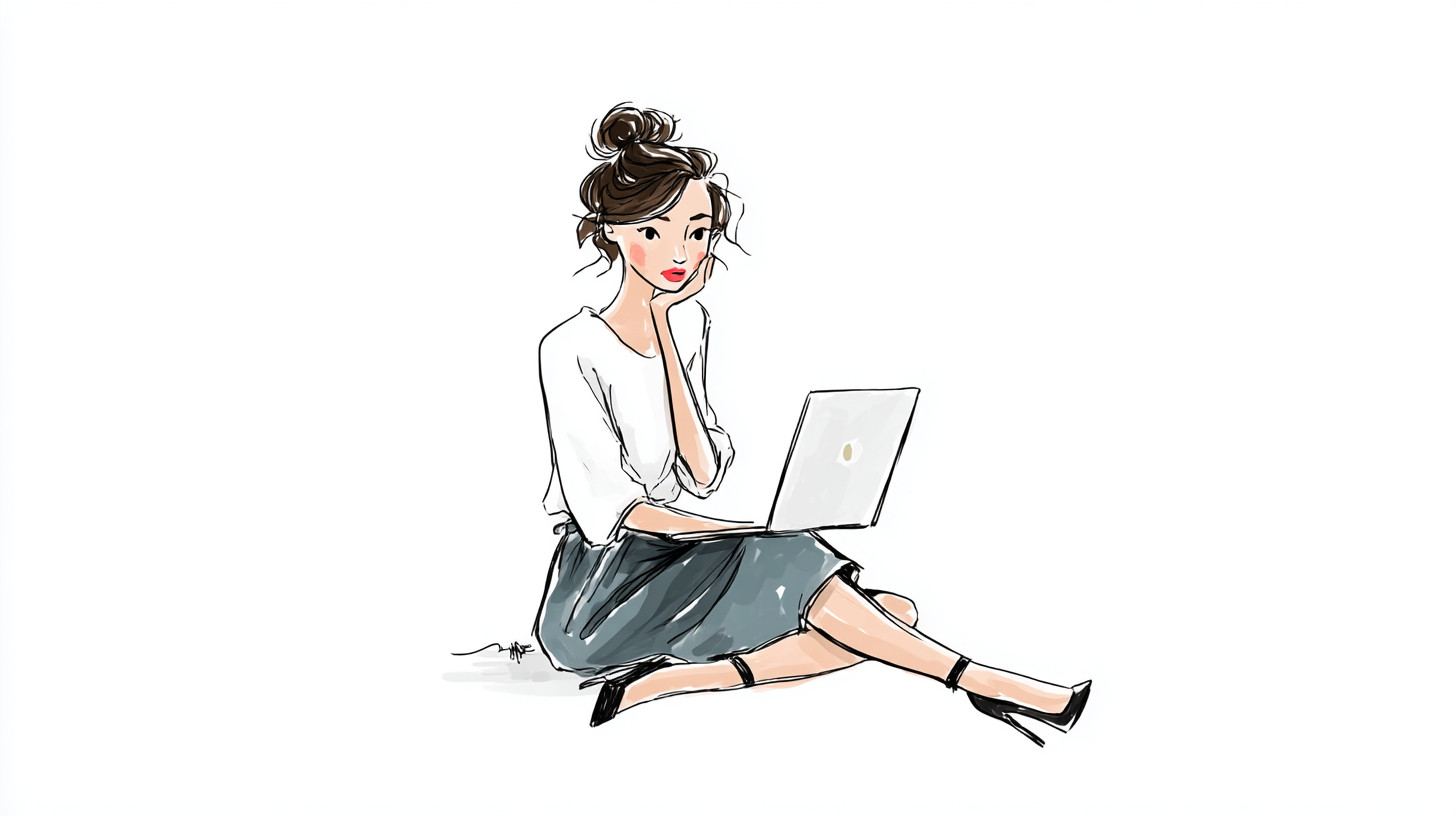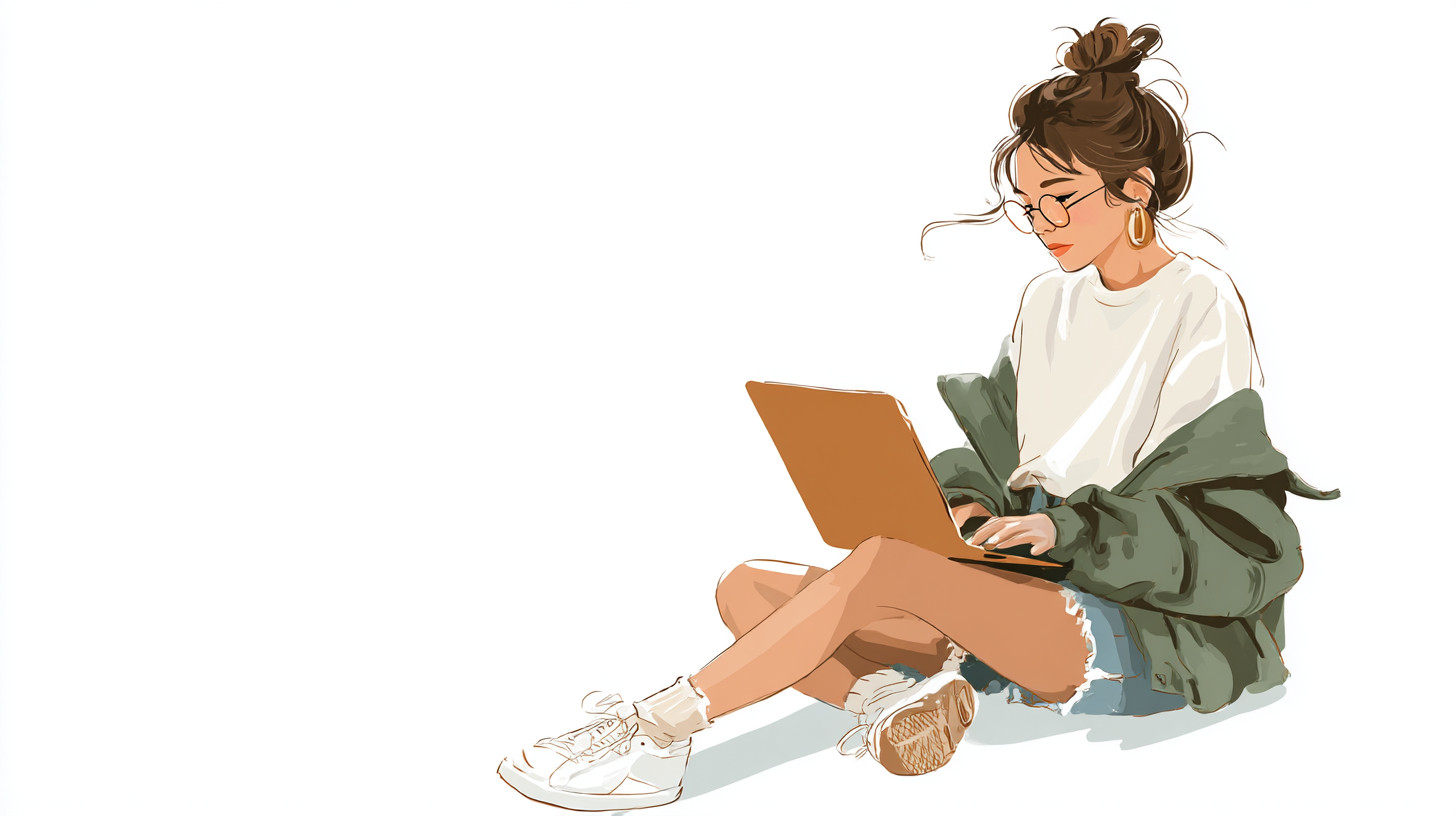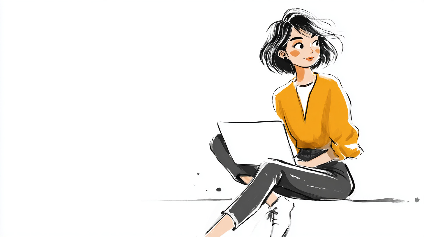 Soft hand-drawn illustration of a young woman in fashionable clothing. She is working on a laptop. A simple, lean but cute illustration. White background. --ar 16:9 --v 7.0