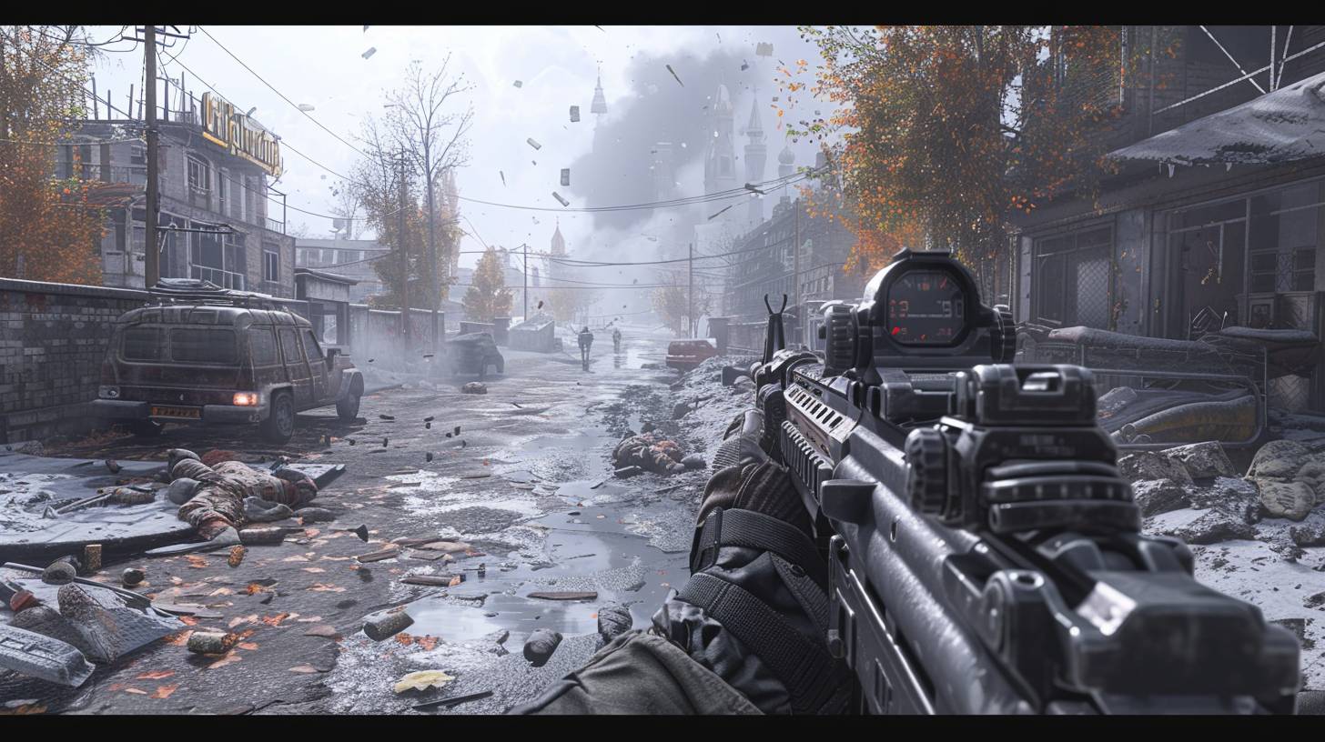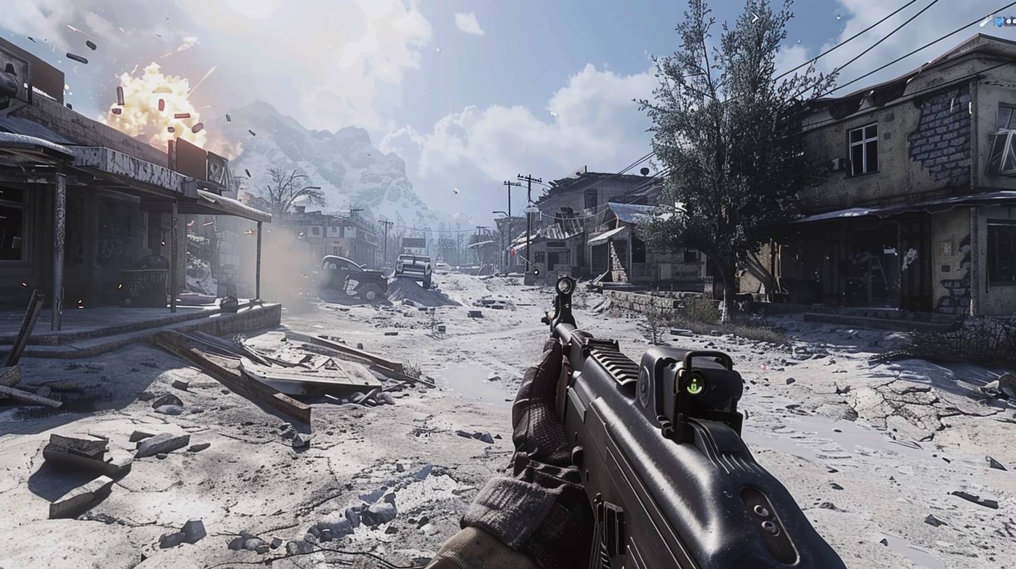 عرض من منظور الشخص الأول في خريطة Call of Duty، الانخراط في القتال مع الخصوم، البندقية جاهزة لإطلاق النار، مصممة لجعل تجربة اللعب غامرة، مع أجواء من الكثافة والحضور، أسلوب يركز على المنظور مع رسم تفصيلي وجذاب.