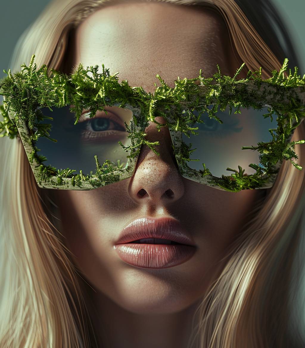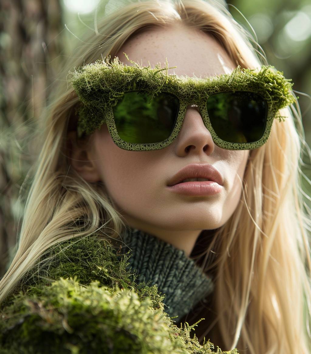 fashion sunglasses designed from plant moss, street wear style, urban elegant and bio-made, worn by a blonde woman with long hair, focus on the flagship piece, natural environment, high resolution 3D conceptual visualization, --ar 7:8 --v 6.0 --style raw