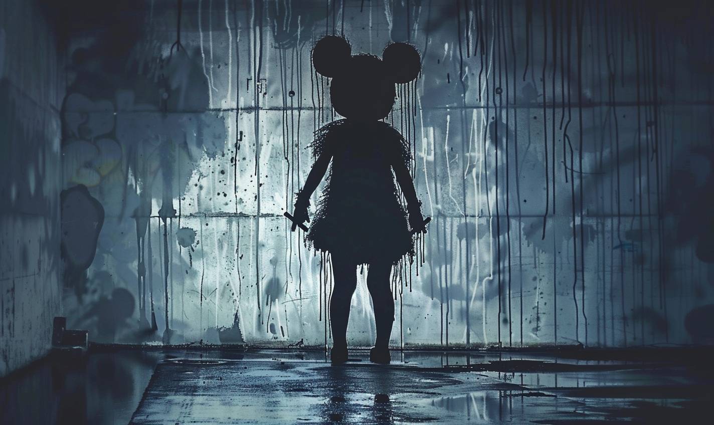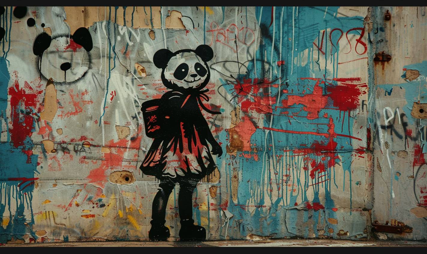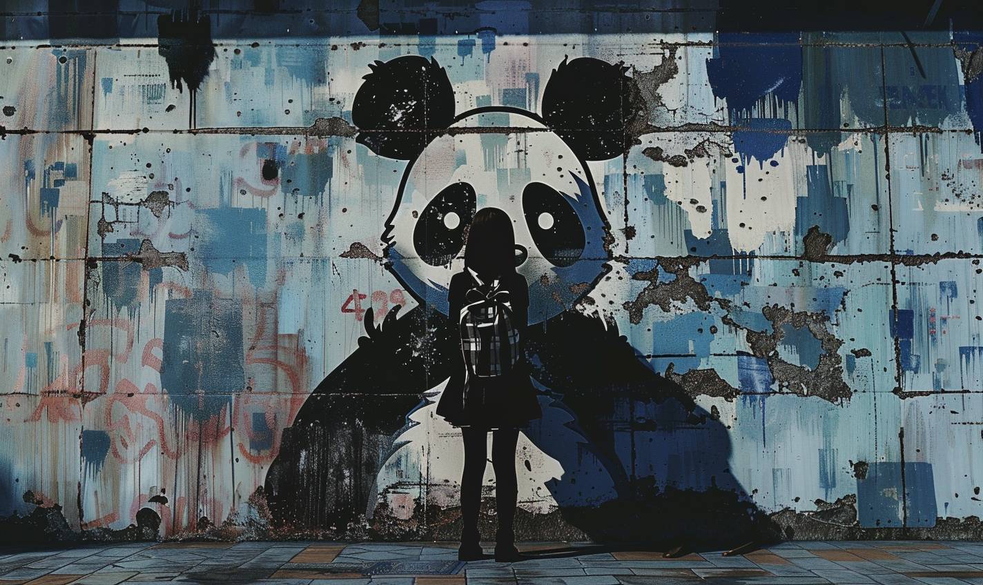 أسلوب بانكسي، ظلال فتاة ترتدي بدلة باندا على حائط، فن حائطي، 4K