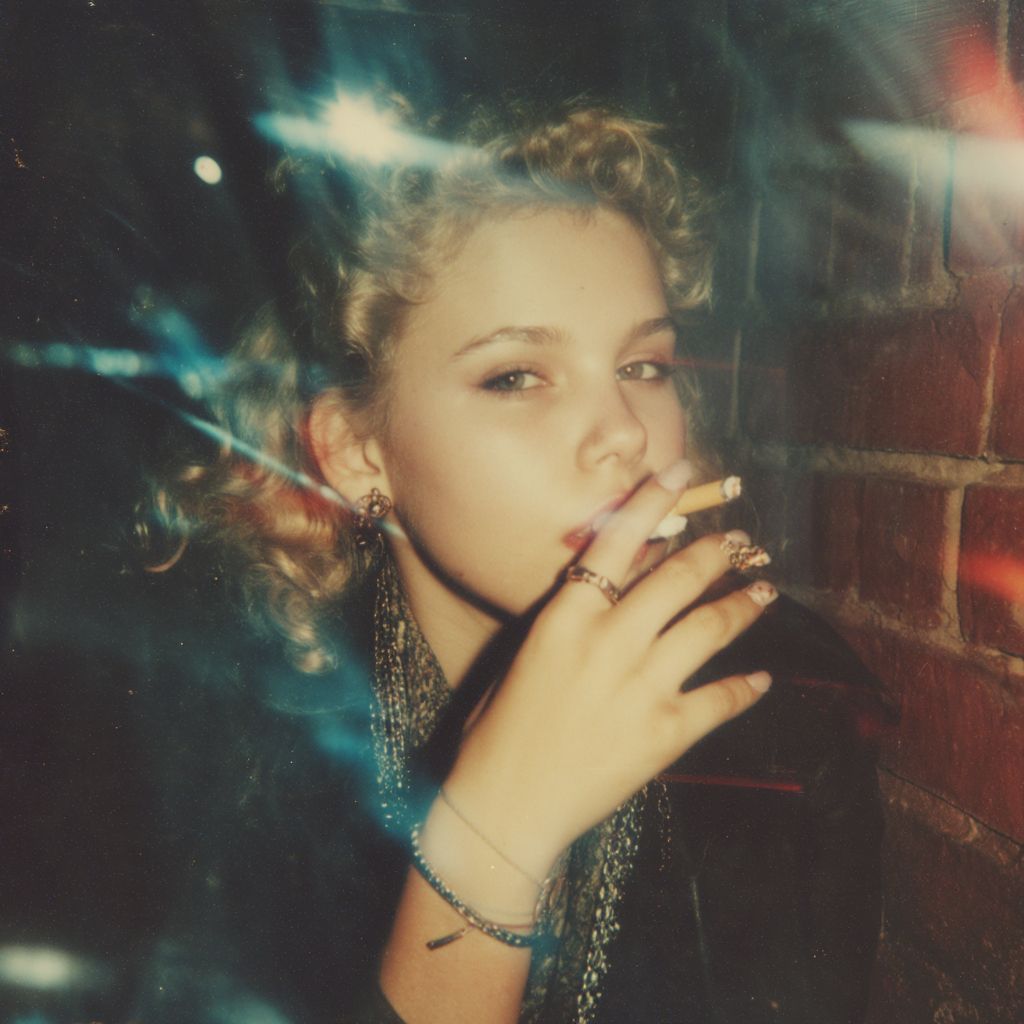 صورة بتقنية بولارويد لامرأة شقراء تبلغ من العمر 30 عامًا في زقاق في الليل من التسعينيات، تدخن سيجارة، ترتدي أزياء الجرنج، تصوير فلاش، فيلم ملون، أسلوب تناظري، غير مثالي، تعريض مزدوج طفيف.