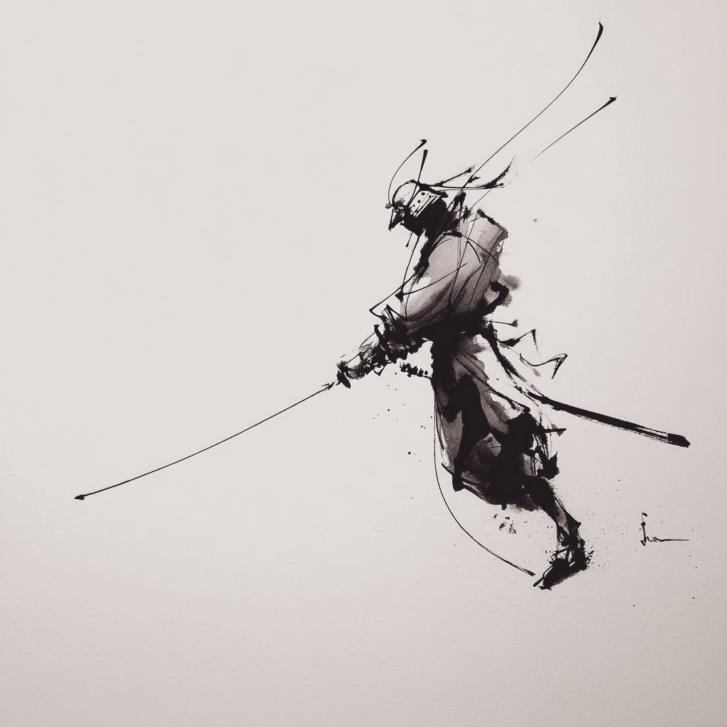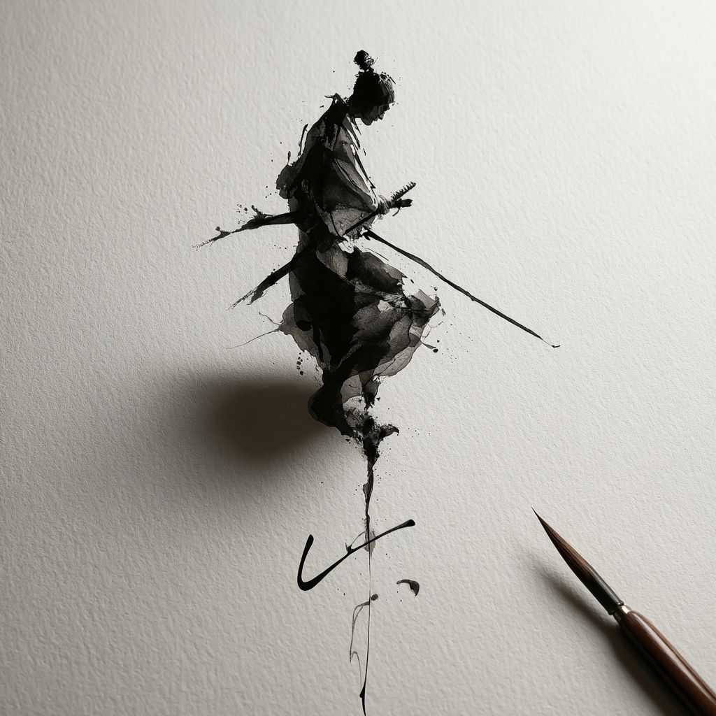 رسم حبر بسيط للساموراي يركز على الإيماءة وتقليل الشكل