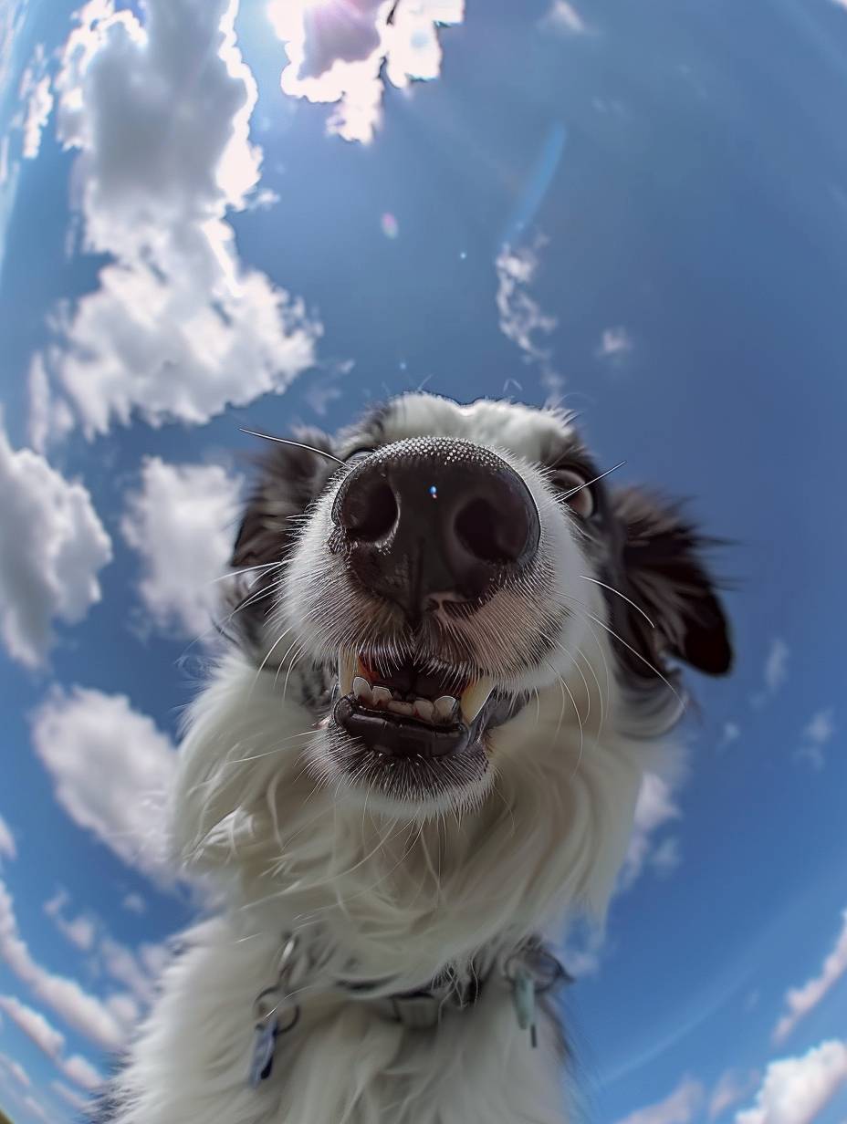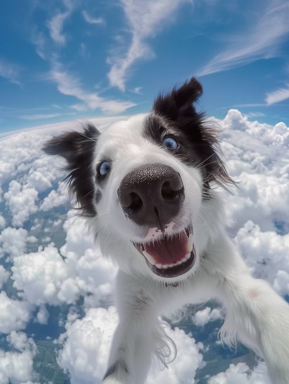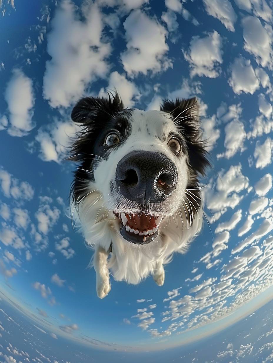 GoPro footage of an cute white and black Border Collie skydiving, Chubby, cute, furry,smile, fluffy fur and wide open eyes, looking up at the camera, clear skies with white clouds in the background, filmed with a fisheye lens,3D character,Pixar animation style, minimalism, --chaos 10 --ar 3:4 --style raw --stylize 200 --v 6.0