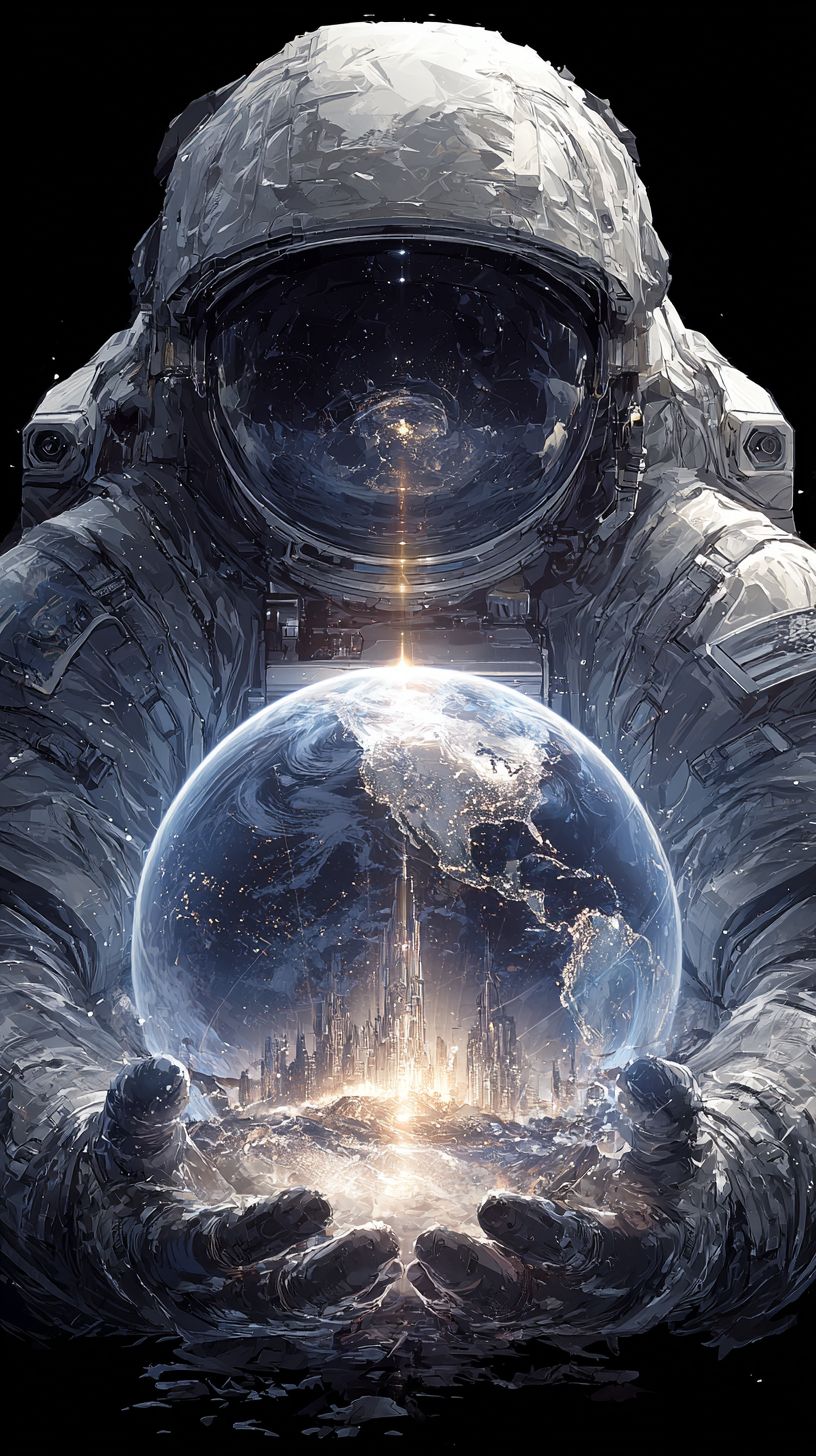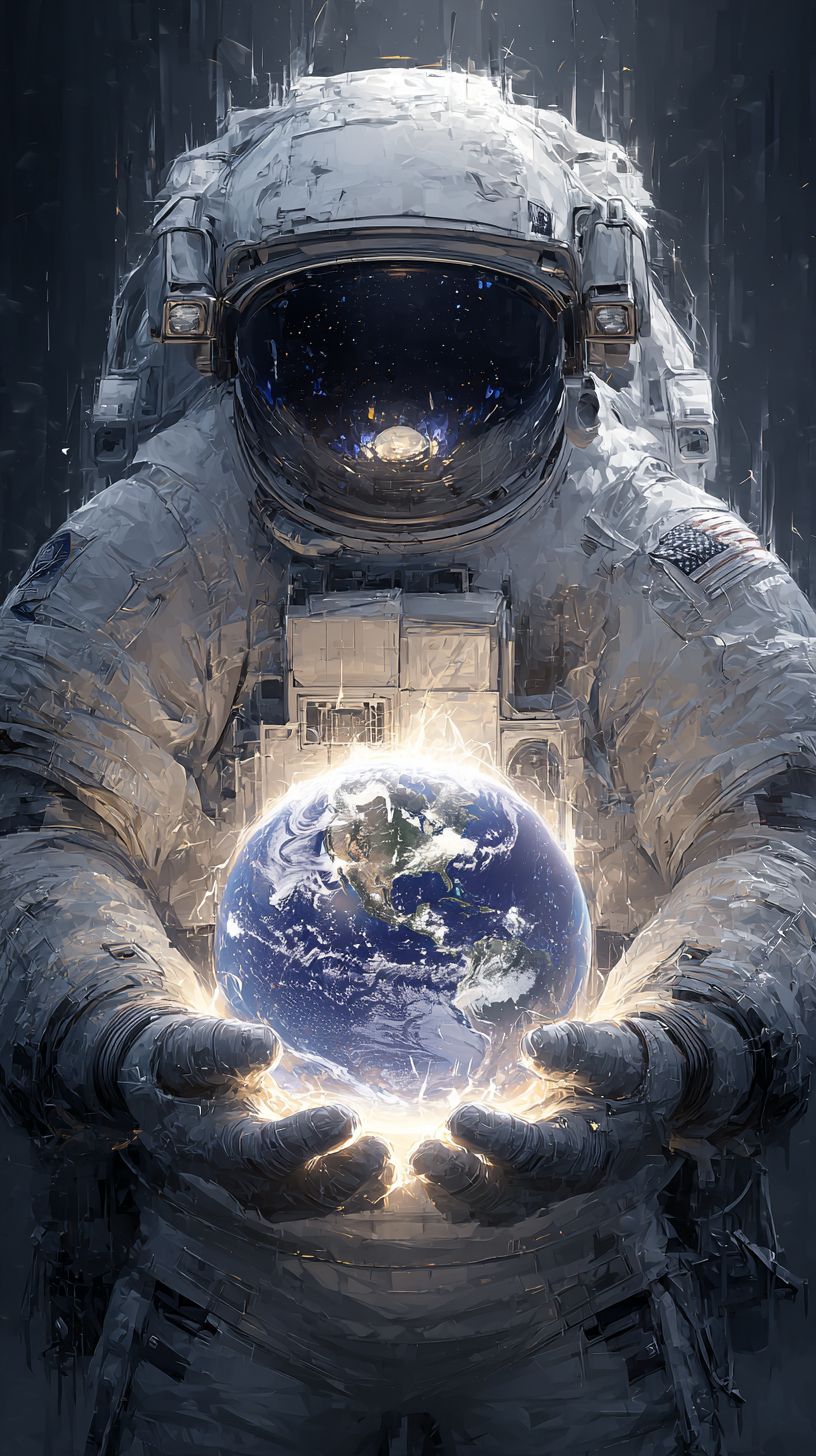 An astronaut holding the Earth in their hands, surrounded by space and stars. The planet is glowing with light as if it were illuminated from within. They wear an advanced spacesuit that reflects realistic details of fabric textures and metallic accents. In front of them, there's another small world floating around. A detailed illustration with a focus on realism and high resolution, in the style of a photorealistic digital painting. The picture was capter in style of National Geografic rainy Nikon Z9 45.7MP camera, ar 1:1 style raw chaos 40 stylize 50 weird 100 quality --ar 9:16 --exp 20 --raw --stylize 750 --v 7.0