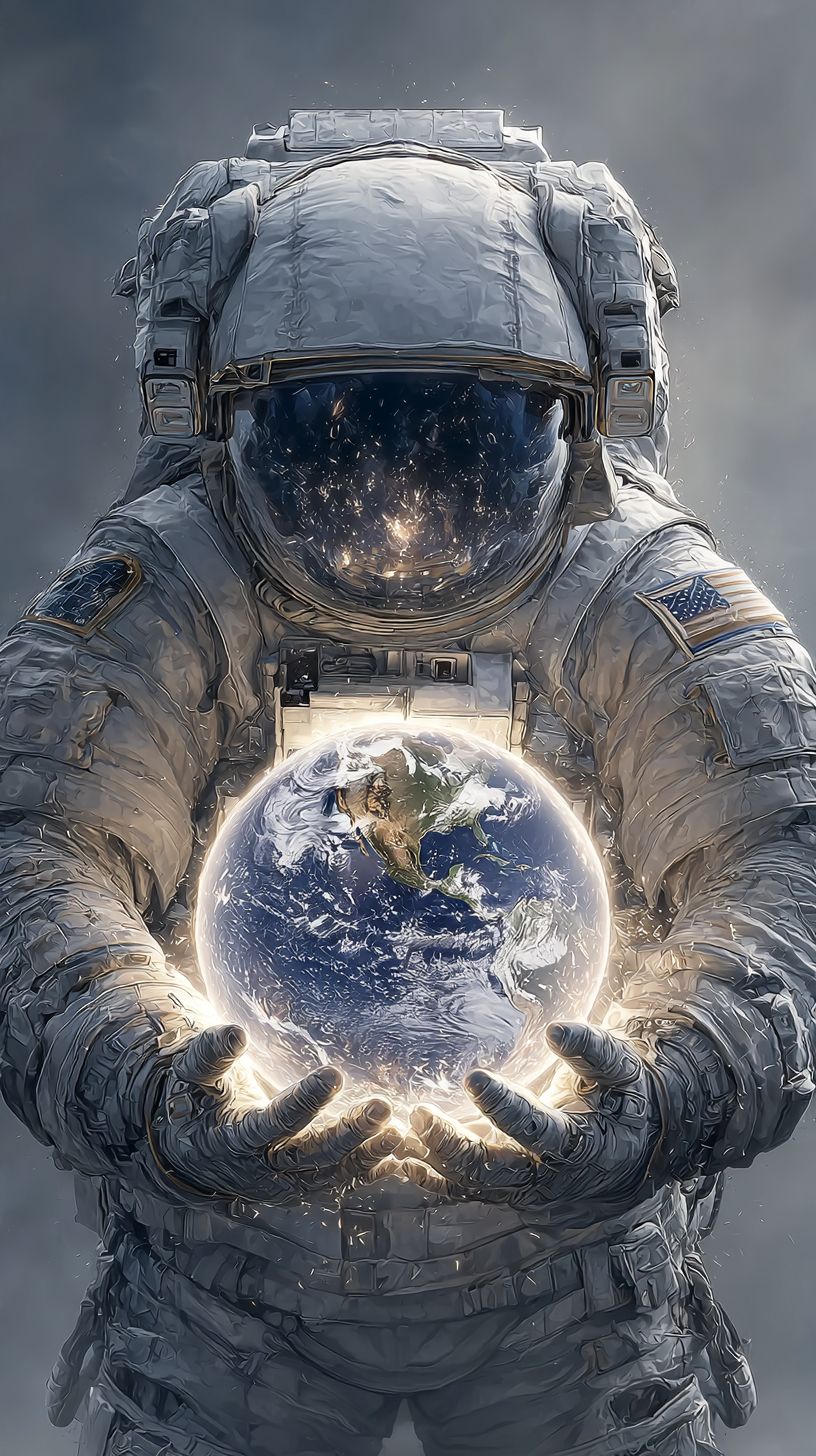 رائد فضاء يحمل الأرض في يديه، محاطًا بالفضاء والنجوم. الكوكب يتلألأ بالضوء وكأنه مضاء من الداخل. يرتدي بدلة فضائية متقدمة تعكس تفاصيل واقعية من نسيج القماش واللمسات المعدنية. أمامهم، هناك عالم صغير آخر يطفو حوله. رسم تفصيلي يركز على الواقعية ودقة عالية، بأسلوب رسم رقمي فوتو ريالستيكي. تم التقاط الصورة بأسلوب ناشيونال جيوغرافيك باستخدام كاميرا نيكون Z9 بدقة 45.7 ميجابكسل.