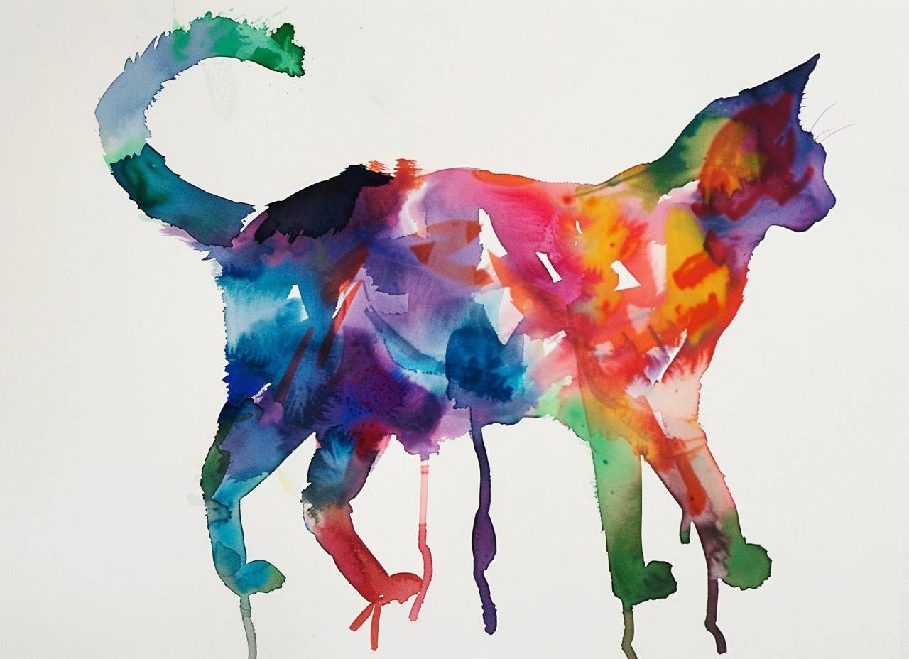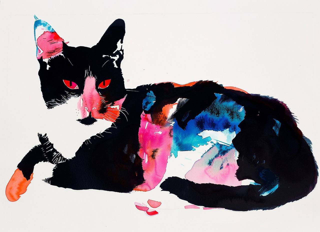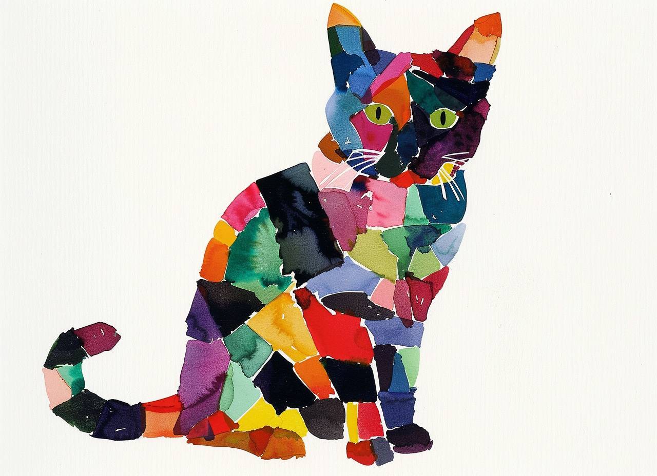 watercolour independant artist alasdair mclellan. about cats, Color blocks are expressed in a simplistic way, In the style of Surrealism, Colors are mainly bright and colorful. --ar 100:73 --style raw --stylize 50 --v 6.0