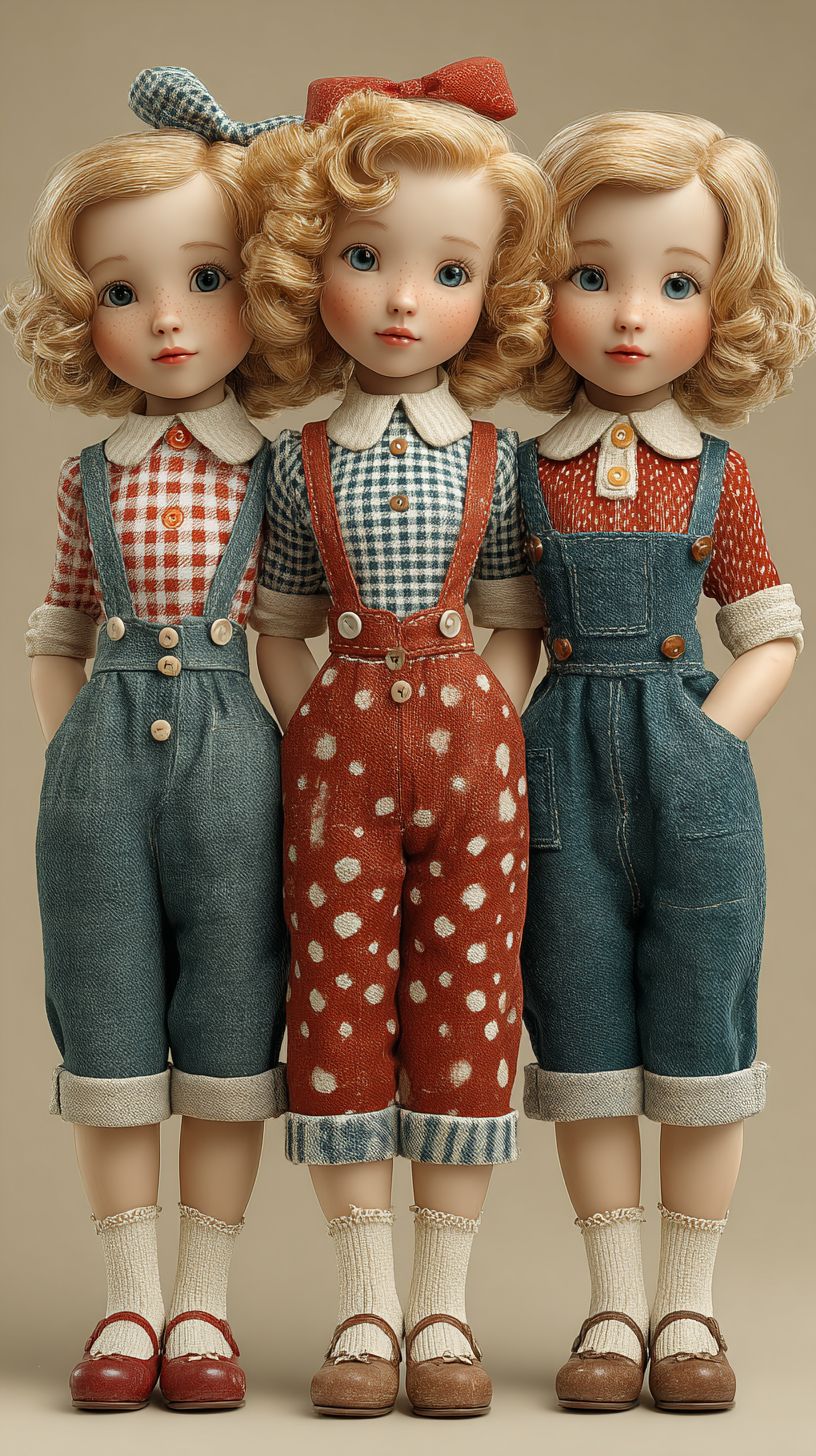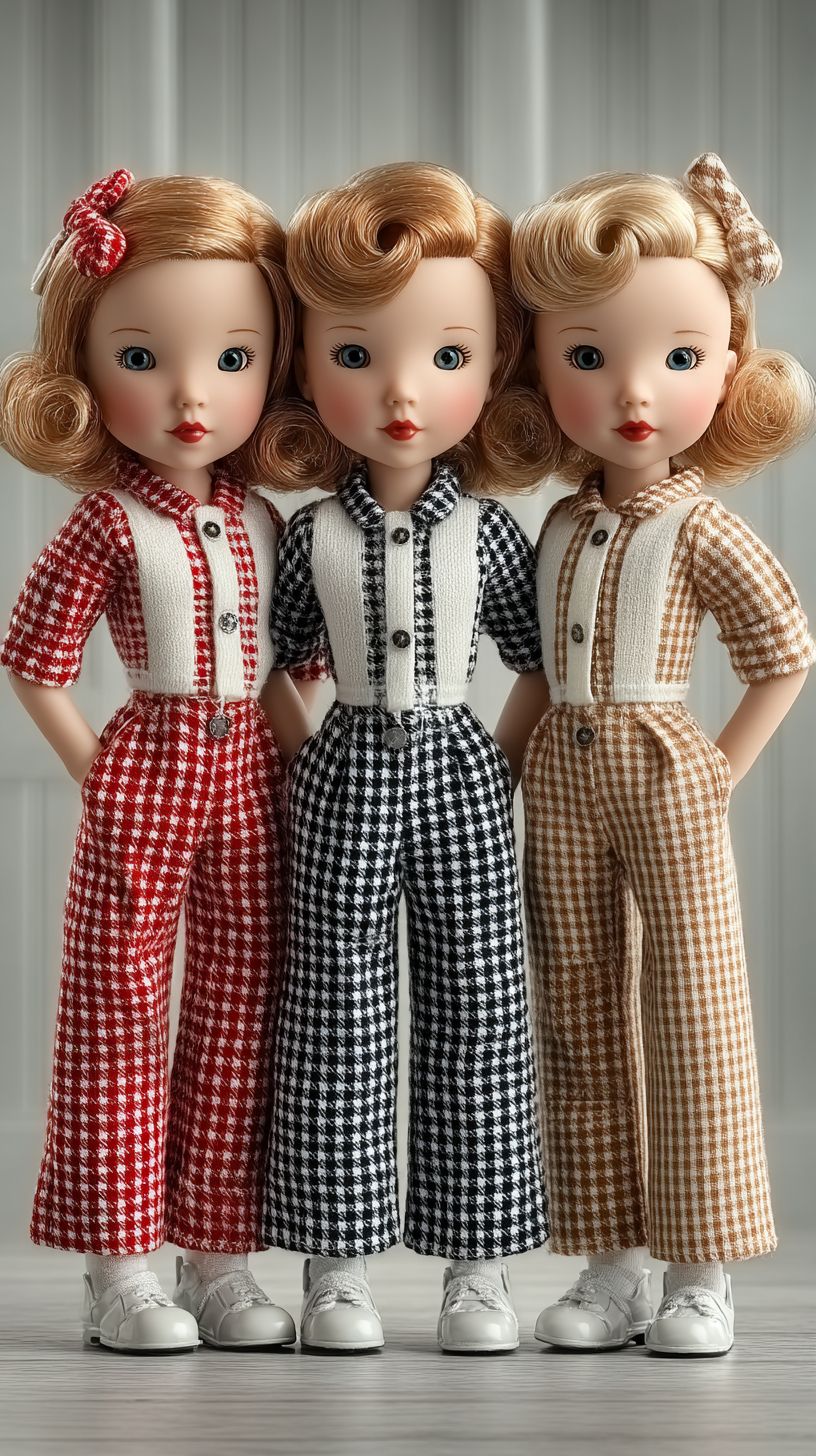 ثلاث دمى عتيقة بطول 18 بوصة ترتدي بدلات لعب مستوحاة من أربعينيات القرن الماضي، بأنماط مربعة حمراء وسوداء وزرقاء ونقاط، تقف جنبًا إلى جنب، إضاءة واقعية، أزياء أمريكية عتيقة، منظر أمامي، خلفية ناعمة، أسلوب رسم كتالوج خياطة.