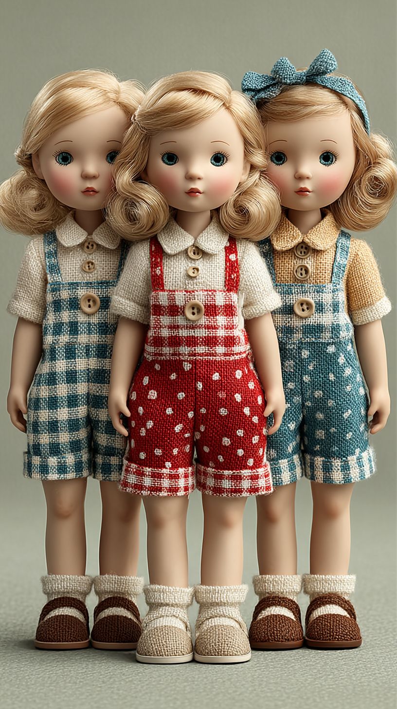 three vintage-style 18-inch dolls wearing 1940s inspired play suits, red, white, and blue checkered and polka dot patterns, standing side by side, realistic lighting, retro American fashion, front view, soft background, sewing catalog illustration style --ar 9:16 --stylize 750 --v 7.0