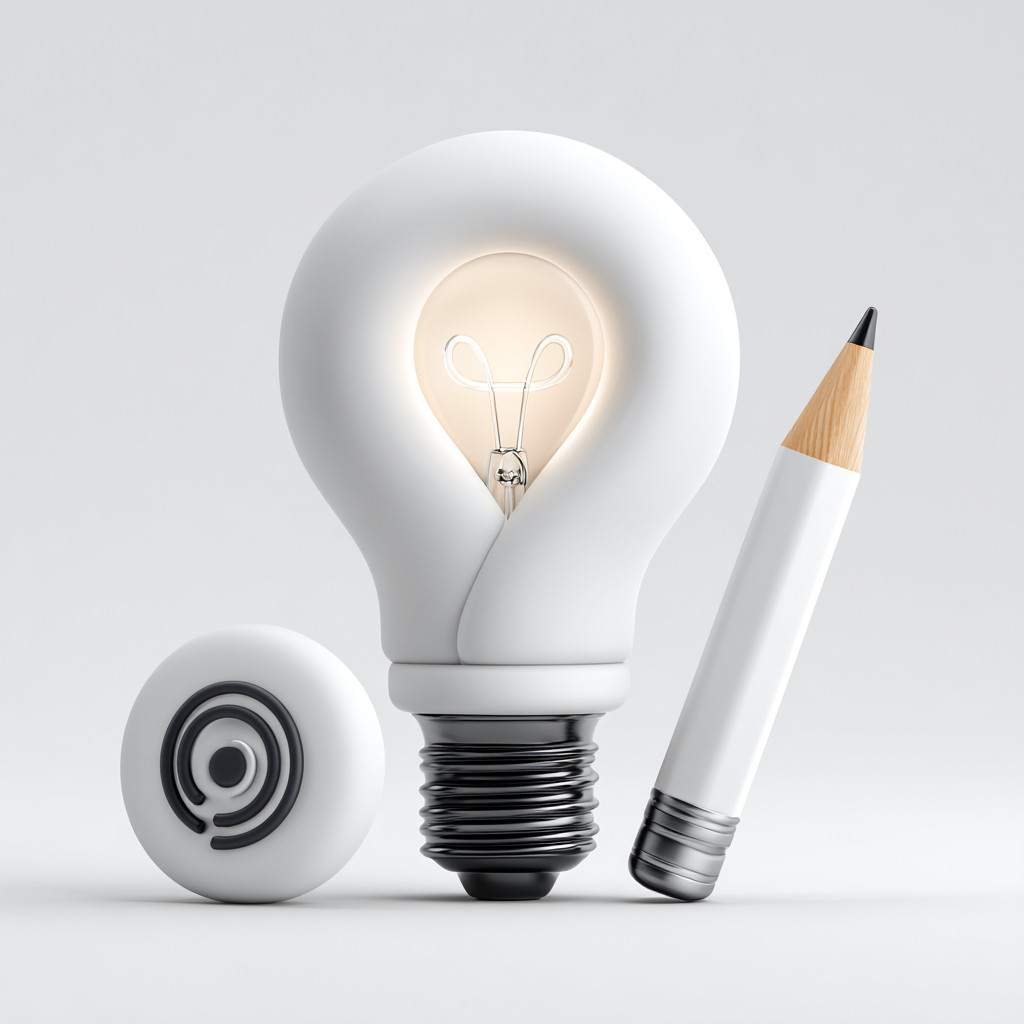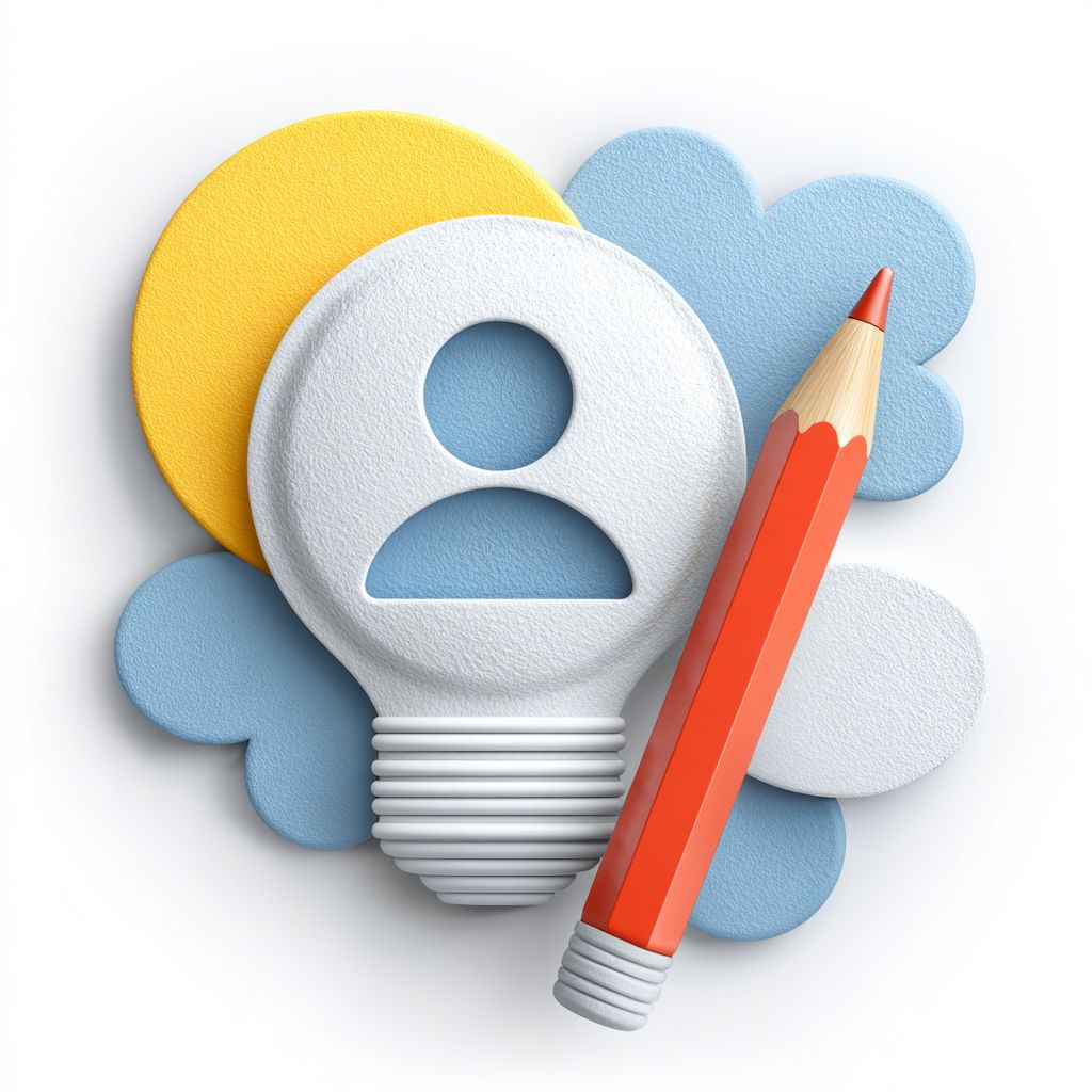 Isolated on white, clean user icon with floating light bulb and sketch-style pencil icon showing creative brand targeting --ar 1:1 --stylize 250 --v 7.0