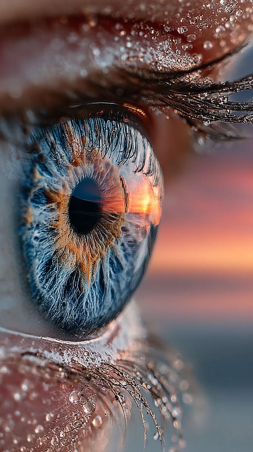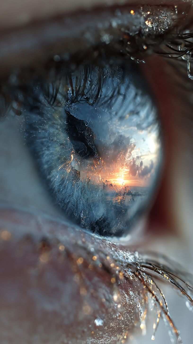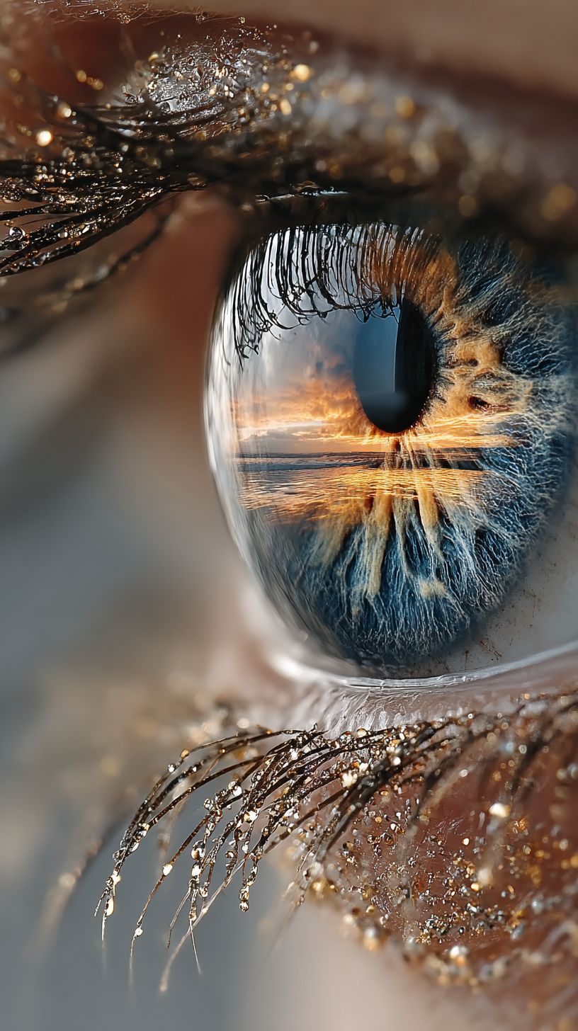عين ساحرة تعكس غروب رومانسي بعيد ومشوش، مما يوحي بالأحلام والاحتمالات