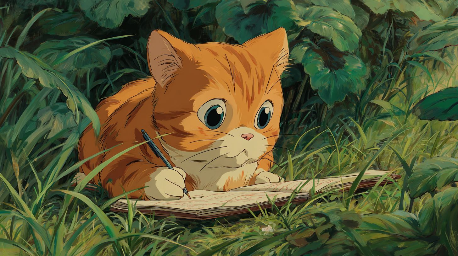 قط برتقالي يجلس على العشب ويكتب شيئًا في دفتر ملاحظات محاطًا بأوراق كبيرة ونجيل بأسلوب انمي توئيف الكلاسيكي