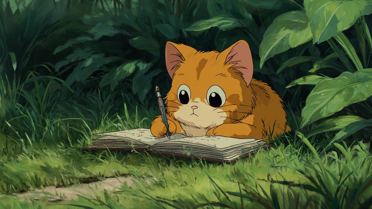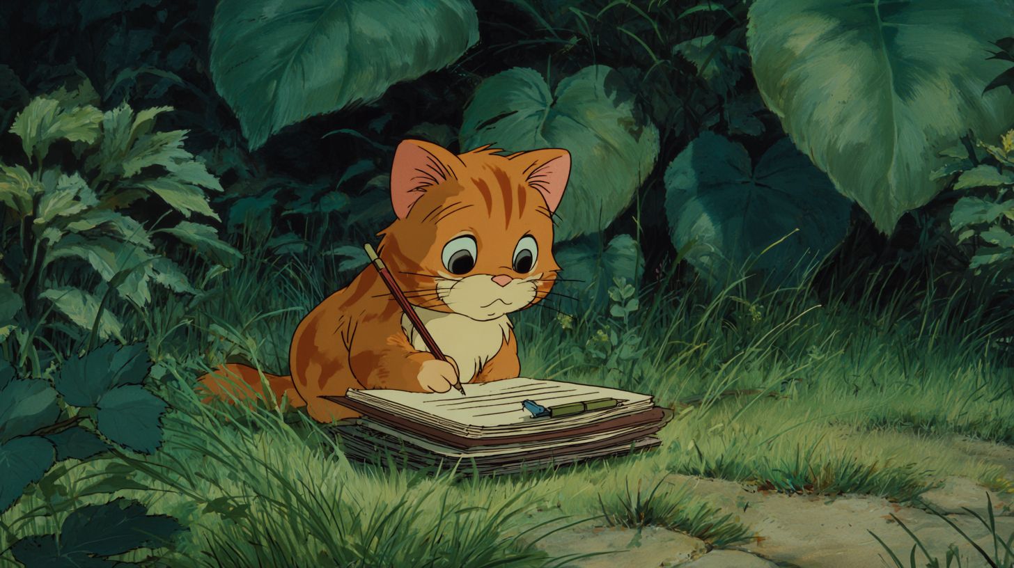 in the style of Toei Animation (Classic Era) - Foundation of mainstream anime. Big eyes, clean lines, iconic nostalgia, wide shot, a orange cat is writing something in the notebook, sitting on the grass, big leafs and grass around, high quality --ar 16:9 --v 7.0