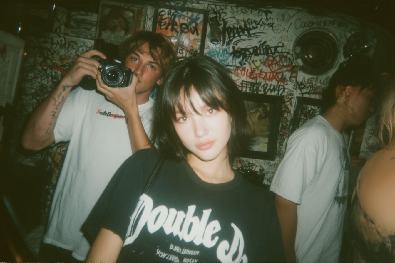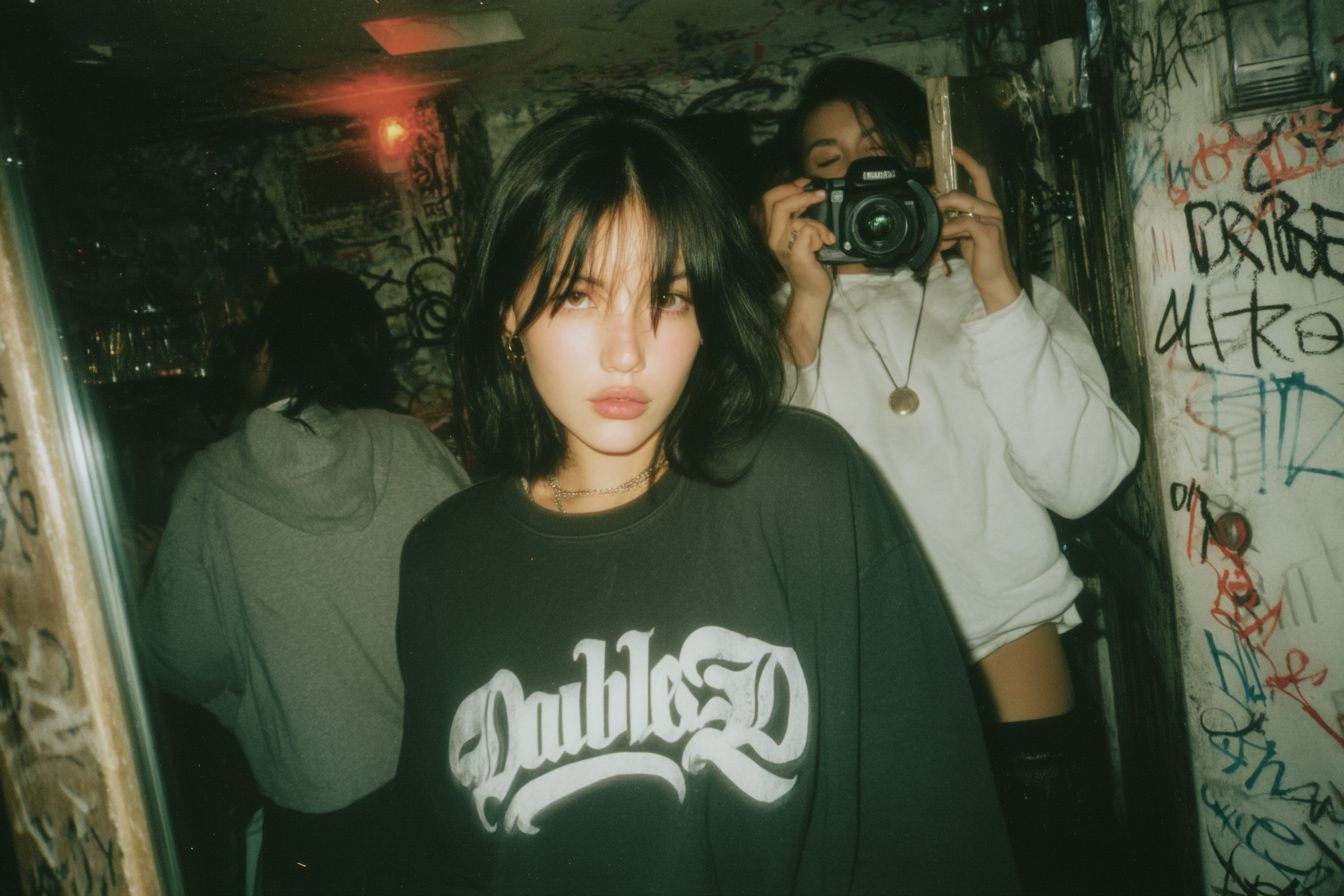 صورة لامرأة آسيوية ترتدي تي شيرت أسود فضفاض مكتوب عليه 'Double D' بأحرف بيضاء جريئة، تلتقط صوراً في نادٍ ليلي مع أصدقائها الذين يرتدون الأبيض والرمادي. الجدار خلفهم يعرض أسلوب الكتابة بالخط المائل. لديها شعر قصير مع غرة وتقوم برفع كاميرا تغطي عينها لتلتقط الصور. تم التقاط الصورة باستخدام تصوير فيلم Kodak Portra بتنسيق متوسط.