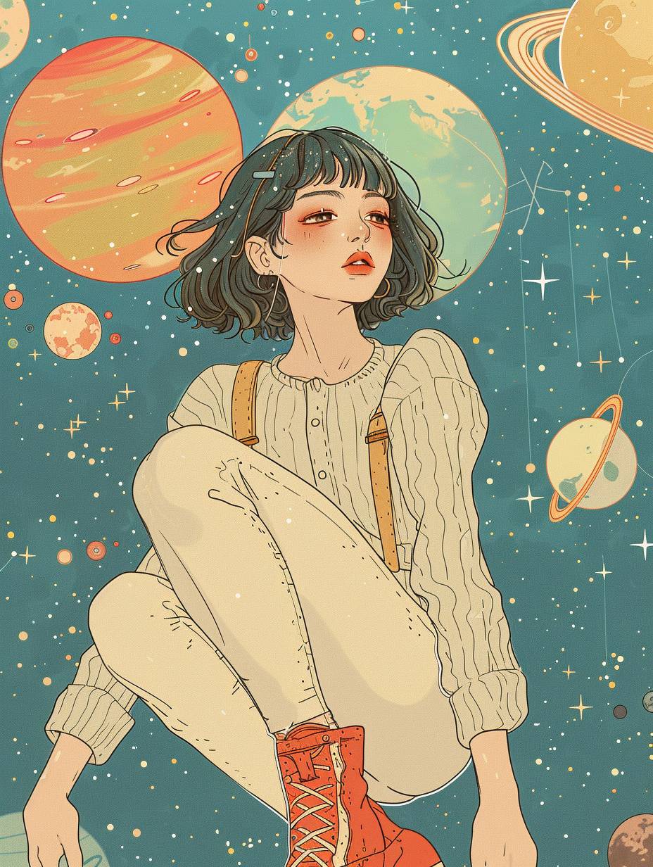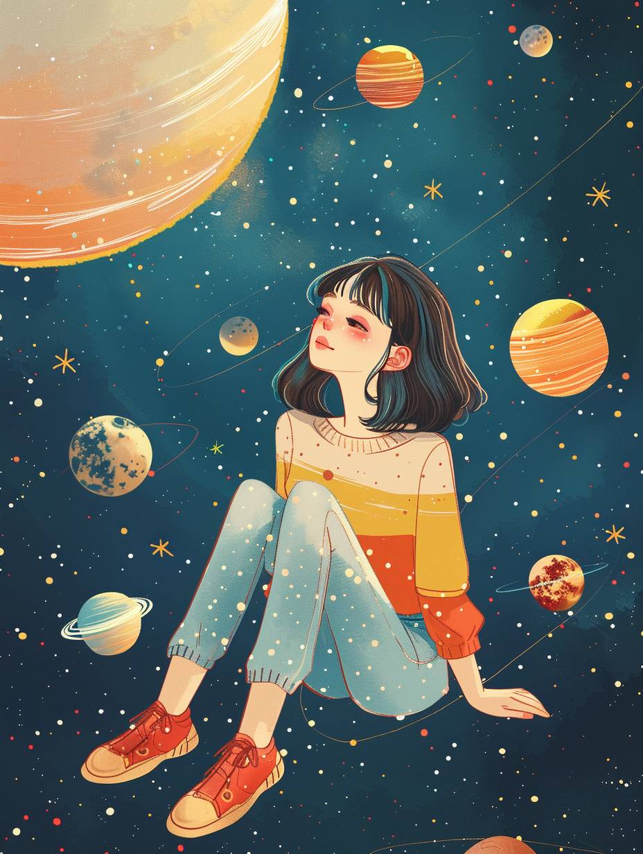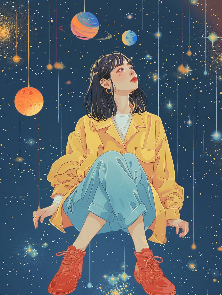 Anya Forger form SPYXFAMILY,with a simple illustration style, on a blue background, using pastel colors and dreamy tones, with simple details, in a flat illustration style, in a dreamlike scenery, with rainbow-colored planets, stars twinkling in the sky, sitting casually with her legs crossed, floating in space, floating on colorful moons, floating on planets. --ar 3:4 --stylize 400 --v 6.0