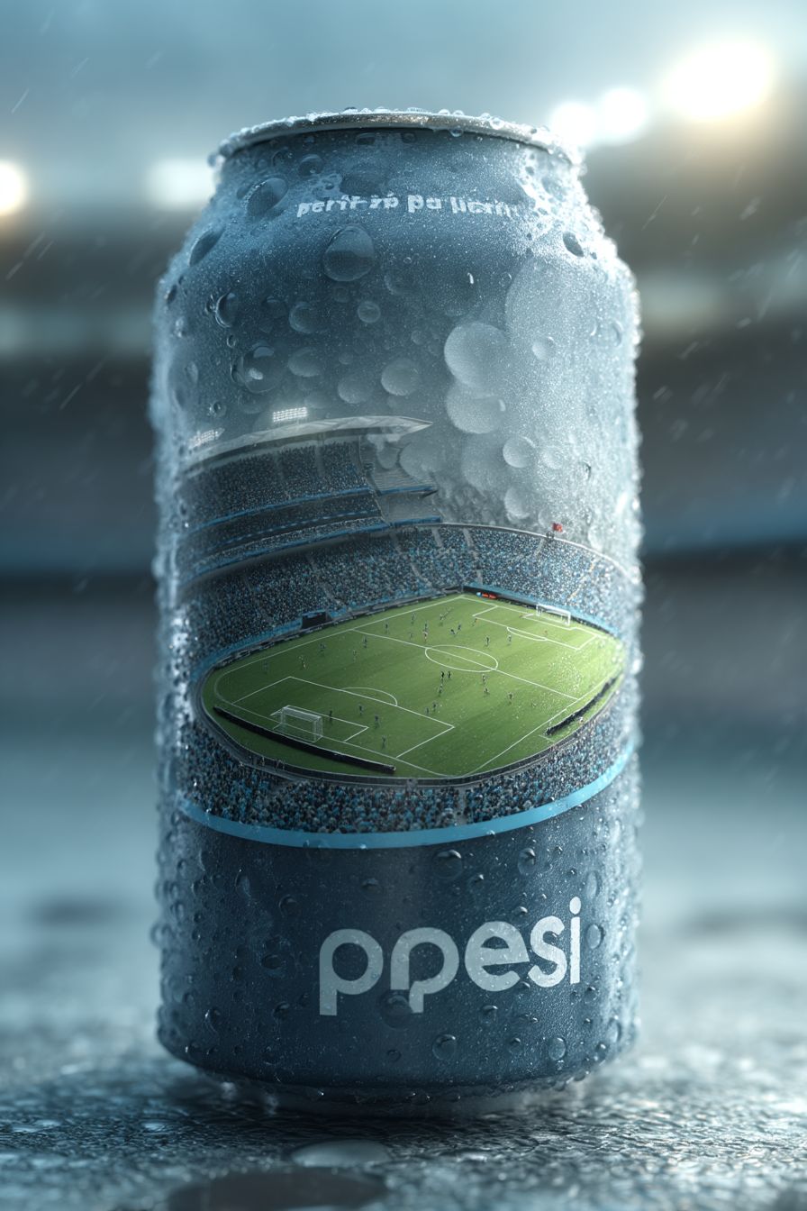 A hyper-realistic, ice-cold Pepsi can, sharply detailed with condensation and water droplets. The top of the can is transformed into a miniature football (soccer) stadium, seen from a slightly top-down angle. Inside: a vivid green pitch, bright stadium floodlights, and tiny players in mid-match, surrounded by a packed crowd of cheering fans. The entire scene is set against a pure white background with clean studio lighting. No text or branding. Cinematic detail, crystal-clear focus, and ultra-sharp textures, bg white --ar 2:3 --quality 2 --raw --profile zwou4hf --stylize 1000