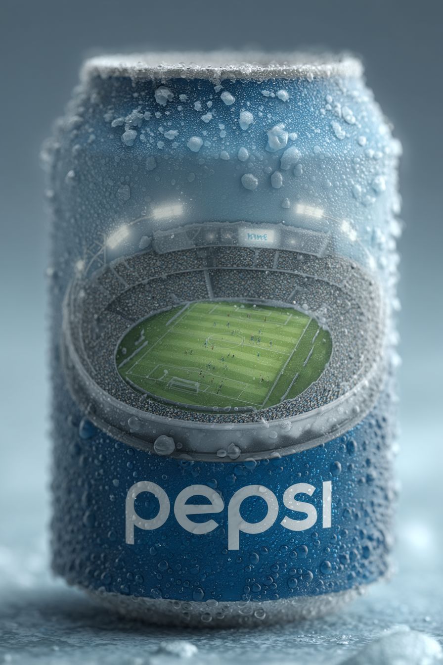 علبة بيبسي فائقة الواقعية وباردة، مفصلة بدقة مع التكثف وقطرات الماء. تم تحويل الجزء العلوي من العلبة إلى ملعب كرة قدم مصغر، يُرى من زاوية أعلى قليلاً. بداخله: ملعب أخضر مشرق، وأضواء ملعبية ساطعة، ولاعبون صغار في منتصف المباراة، محاطون بجموع حاشد من المشجعين. تم إعداد المشهد بالكامل على خلفية بيضاء نقية مع إضاءة استوديو نظيفة. لا نص أو علامة تجارية. تفاصيل سينمائية، وضوح كريستالي، وقوام شديد الوضوح.