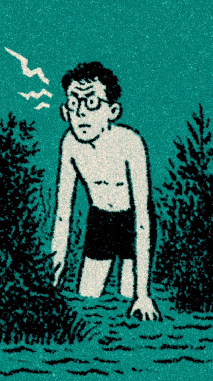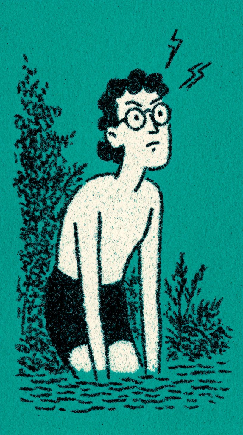 A simple cartoon drawing of an adult female swimmer with glasses, standing on the ground and leaning forward to touch the water, wearing blue swimming trunks that cover his legs up past knee height. She has lightning-like patterns all over her in a dark-blue color, and a small electrical pipe is attached to one leg near eye level. The background should be a flat teal color with no details or shading. It's a simple, minimalistic style cartoon with thick black outlines for easy coloring by children. --ar 9:16 --profile vj5jf2p --s 750
