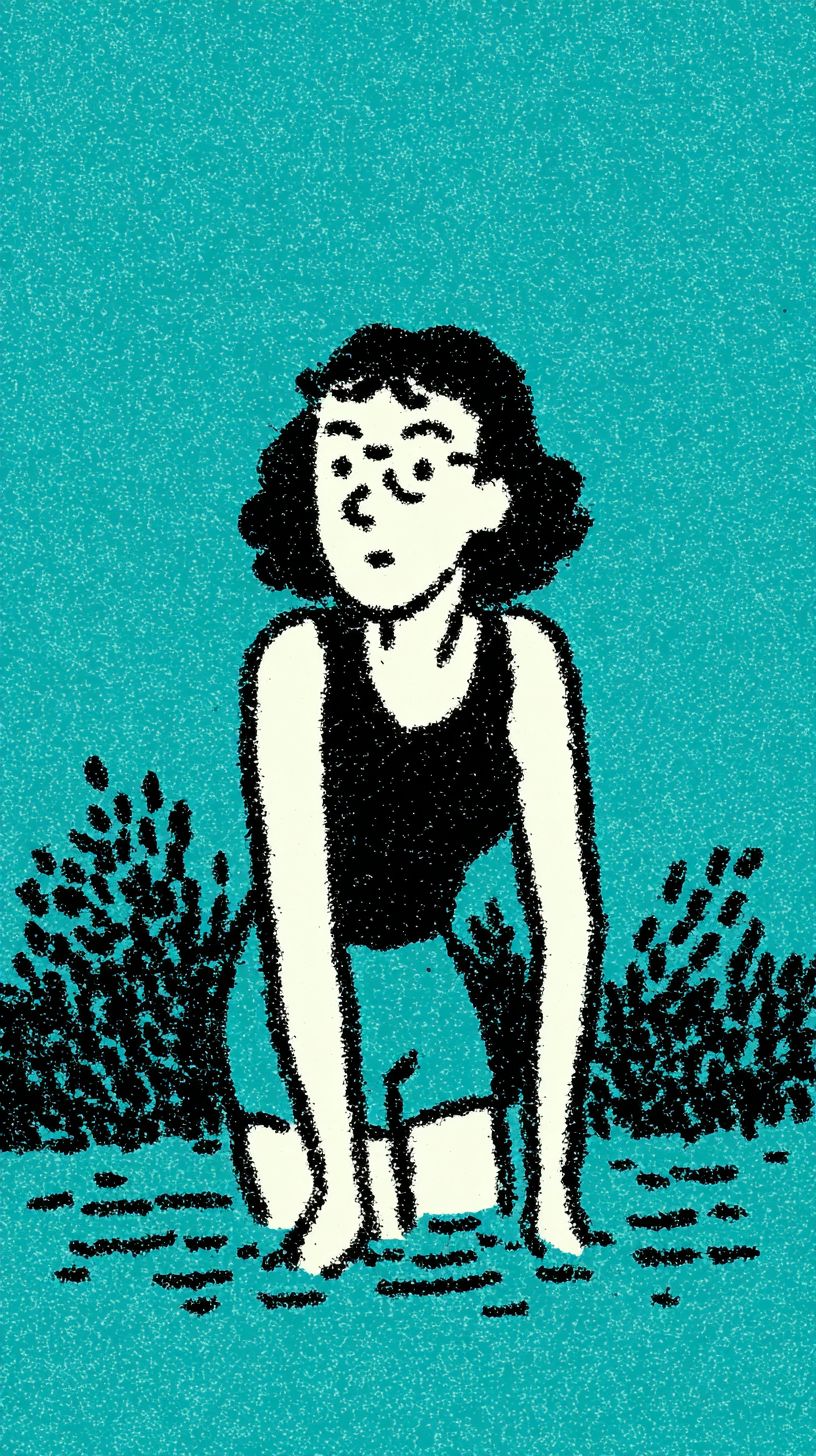 رسم كاريكاتوري بسيط لسباحة أنثوية بالغة ترتدي نظارات، وتقف على الأرض وتميل للأمام لتلمس الماء، مرتدية بدلة سباحة زرقاء تغطي ساقيها حتى فوق الركبة. لديها أنماط تشبه البرق في جميع الأنحاء بلون أزرق داكن، وأنبوب كهربائي صغير متصل بساق واحدة بالقرب من مستوى العين. يجب أن يكون الخلفية بلون تيل مسطح بدون تفاصيل أو تظليل. إنه أسلوب كاريكاتوري بسيط وعصري بخطوط سوداء سميكة لتلوين الأطفال بسهولة.