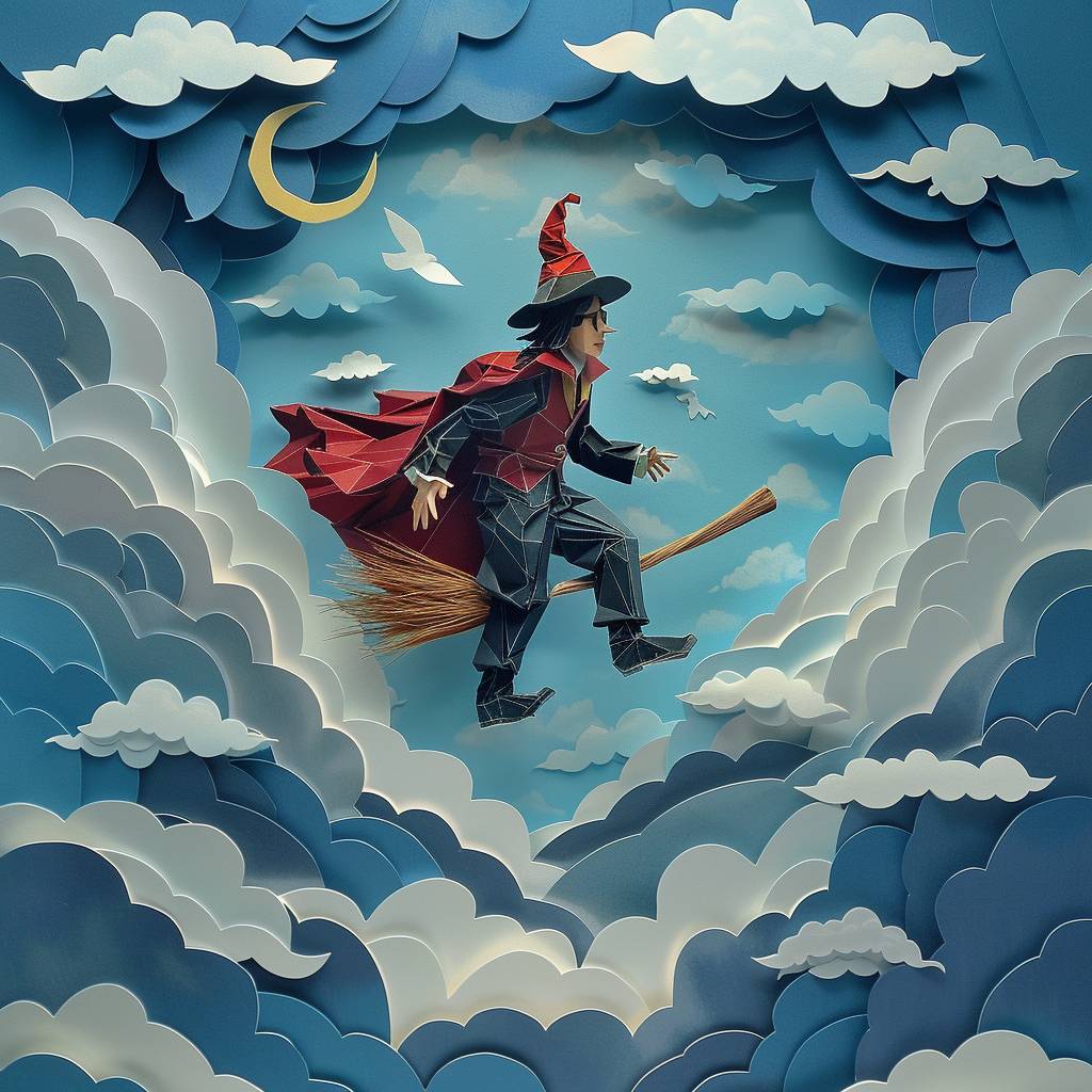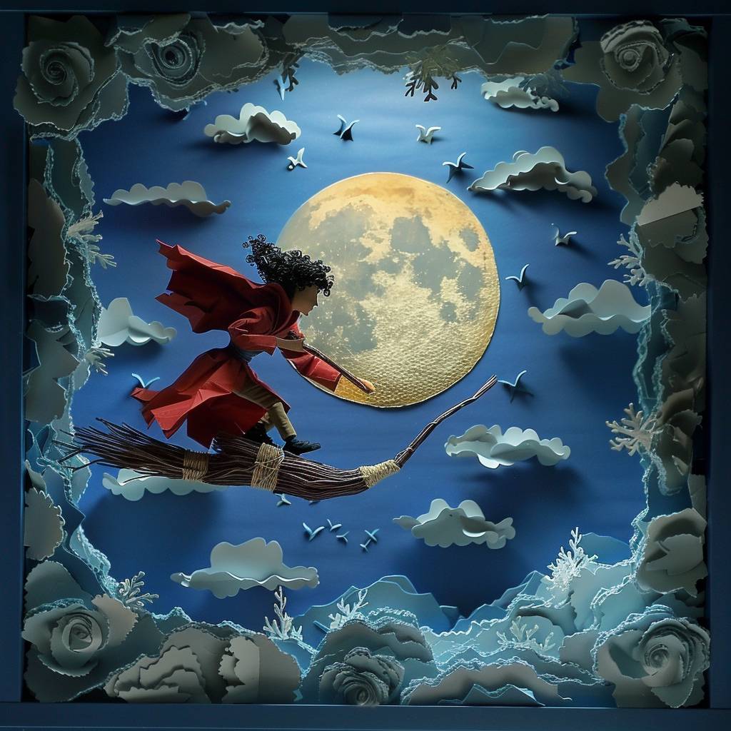 أعمال ورقية من طبقات ومشهد لغاري بوتر وهو على المكنسة في السماء.