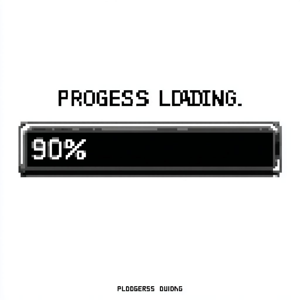 A simple loading bar at 90% progress with digital-style text "PROGRESS LOADING...", flat vector design, monochrome black and gray, rectangular progress bar with subtle pixel style, no background or gradients, high clarity on white background --s 750