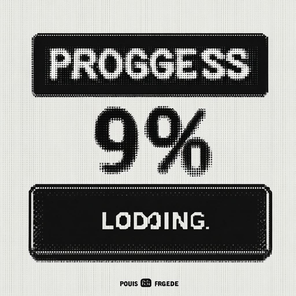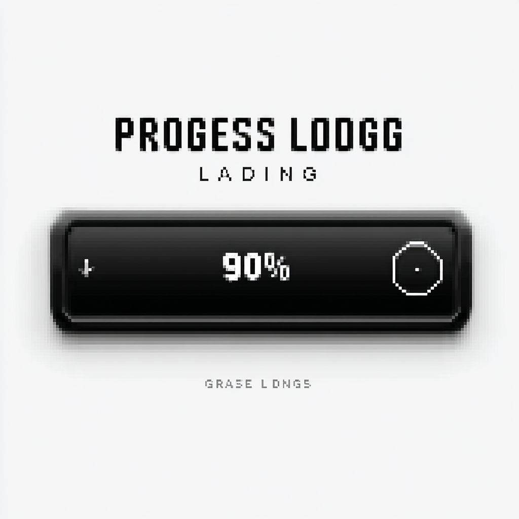 شريط تحميل بسيط بنسبة 90% يتضمن نص أسلوب رقمِي 'تحميل التقدم...'، تصميم شعاعي مسطح، بتدرجات أحادية اللون الأسود والرمادي، شريط تقدم مستطيل مع نمط بكسل دقيق، بدون خلفية أو تدرجات، وضوح عالٍ على خلفية بيضاء.
