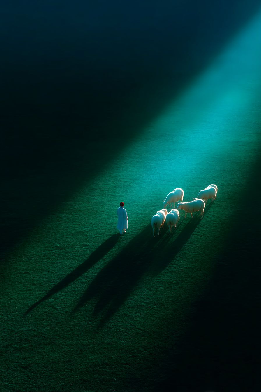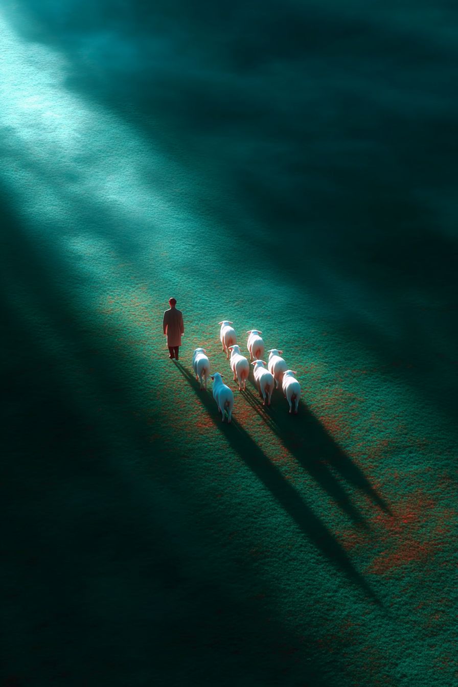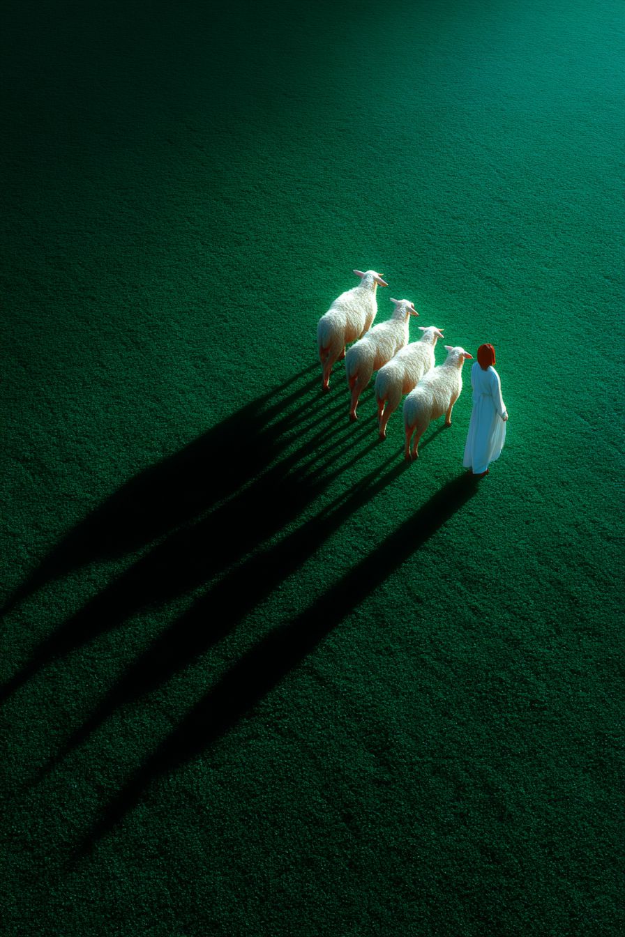 Aerial view of a realistic green field with low green grass, a group of white lambs walking across the field, long dramatic shadows cast on the textured grass, poetic composition, soft morning light, high contrast, 4K --chaos 20 --ar 2:3 --raw --profile phwyj69 --s 750