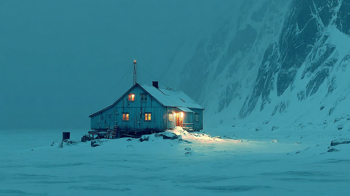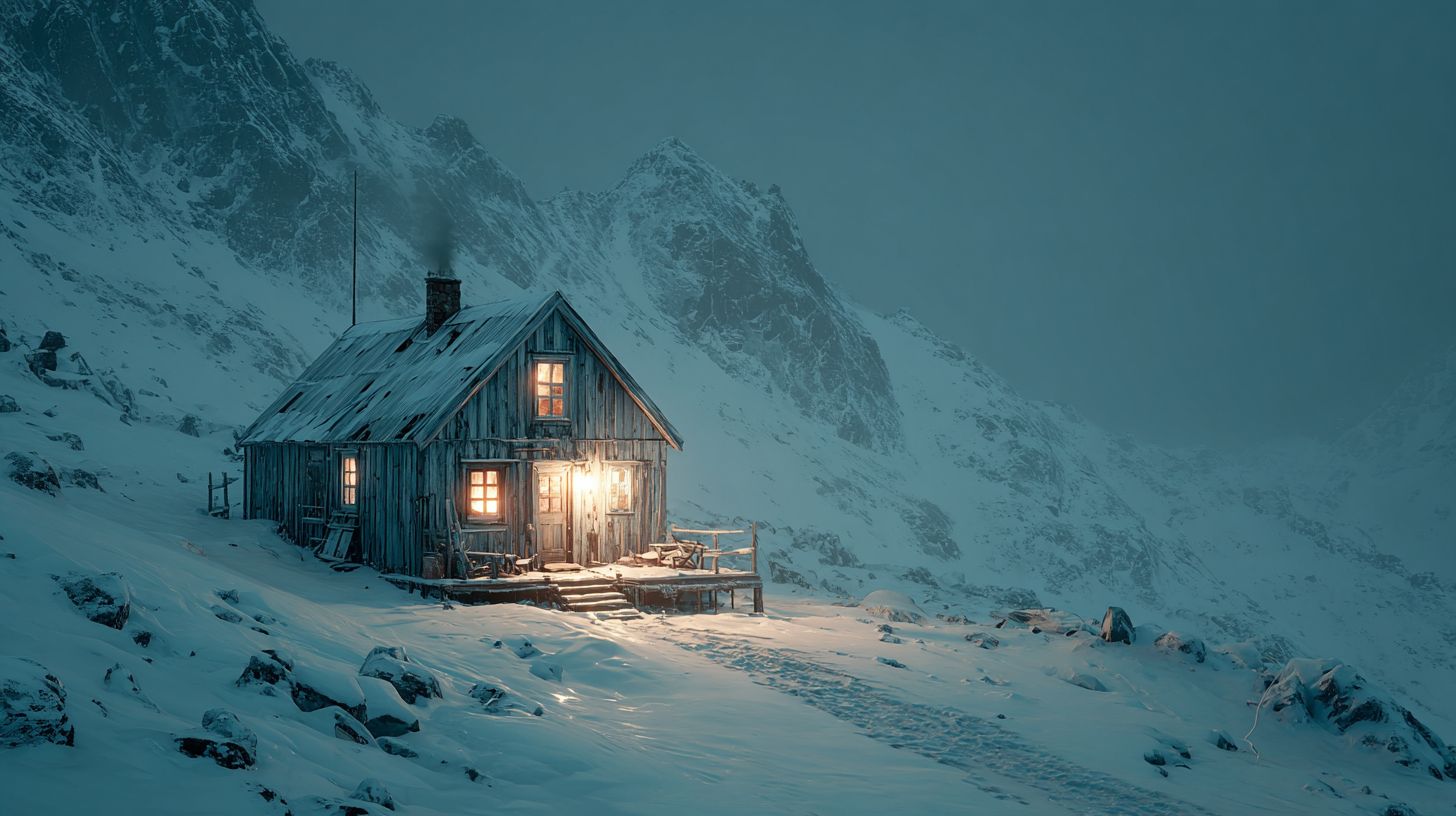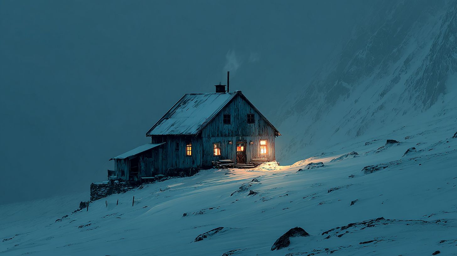 صورة مفصلة جدًا وواقعية لكوخ خشبي منعزل يقع في منطقة جبلية مغطاة بالثلوج. الكوخ هو نقطة التركيز، مبني من خشب قديم ذو نسيج، ويتضمن عناصر معمارية ريفية مثل سقف مائل محمل بالثلج الكثيف، وجسور خشبية ظاهرة، ومدخنة متواضعة تصدر دفقًا رفيعًا من الدخان. إنها ليلة مظلمة، شبه سوداء، محاطة بضباب كثيف ومرعب، مما يحد من الرؤية ويخلق أجواء غامضة ومعزولة. لا توجد أشجار أو نباتات أو أي شكل من أشكال النبات، مما يبرز المنظر القاحل والصارم المحيط بالكوخ. في الخلفية البعيدة، المخفية جزئيًا بواسطة الضباب الكثيف، ترتفع المنحدرات الجبلية الوعرة وراء الكوخ، مما يضيف عمقًا ومقياسًا للصورة. الأرض مغطاة تمامًا بثلج عميق وغير مزعزع بسمك كبير، تظهر انحناءات ناعمة وتضاريس لطيفة ناتجة عن تساقط الثلوج الكثيف. نسيج الثلج مرئي، مفصل وواقعي، مع ظلال دقيقة وإبرازات تميز عمقه. يتلألأ الضوء الدافئ، الذي يميل إلى اللون الذهبي، من نوافذ الكوخ، مما يتناقض بشدة مع البيئة الخارجية الباردة والداكنة، مما يخلق هالة جذابة ولكن غامضة. تعكس هذه الإضاءة الداخلية الدافئة بشكل ناعم الثلج القريب، مما يمتزج بلطف مع نغمات الخارج الباردة. يجب أن تكون الأجواء حالمة وغامضة، وتعبر عن شعور بالعزلة القاسية، والدفء في العزلة، وعمق الجاذبية من خلال الانتباه الدقيق للإضاءة والظلال والملمس والتأثيرات البيئية.