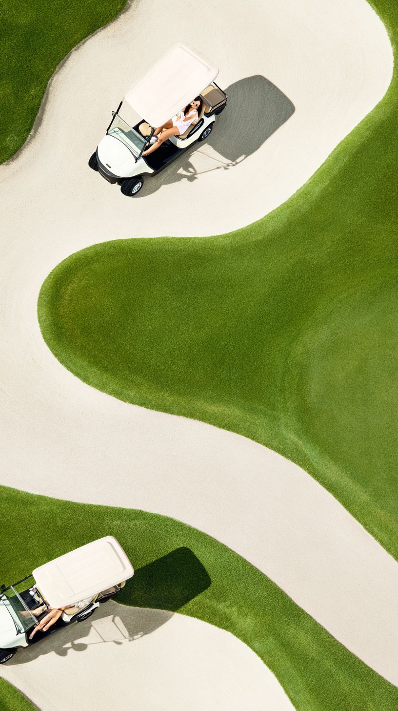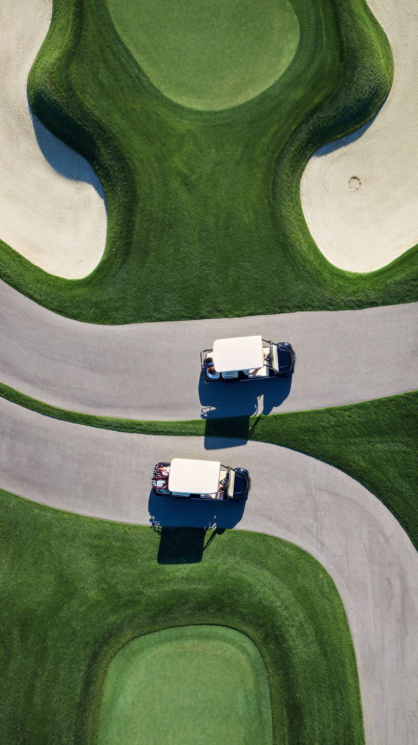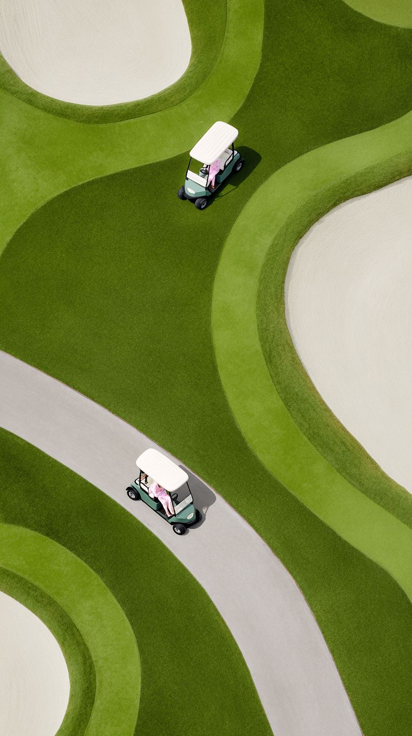 Aerial fashion editorial scene shot from high above a pristine, vibrantly green golf course. The focus is on a pair of small golf carts traveling along a winding paved path, with neatly sculpted sand bunkers and putting greens surrounding them in elegant, organic curves. The bright white cart roofs and the surrounding deep green fairway create a bold graphic contrast when viewed from above. Inside each cart, a model dressed in minimalist, pastel or off-white Jacquemus-style resortwear is seated viewed from the top down, their posture relaxed and stylish. A few golf bags are mounted to the back of each cart, but their presence is subtle, keeping the attention on the sculptural landscape and the serene, curated lifestyle moment. The image is composed to be symmetrical and balanced, with negative space emphasizing the curves of the terrain. The overall color palette is saturated but refined lush greens, warm sand tones, and soft white details, giving the image an editorial sense of calm, luxury, and tongue-in-cheek sophistication. Jacquemus fashion editorial, aerial photography, surreal geometry, graphic landscape design, luxury golf lifestyle, photorealistic, minimalist fashion, art direction, overhead composition, pastel color styling, campaign visual cohesion --ar 9:16 --raw --profile aaquy1k --stylize 0