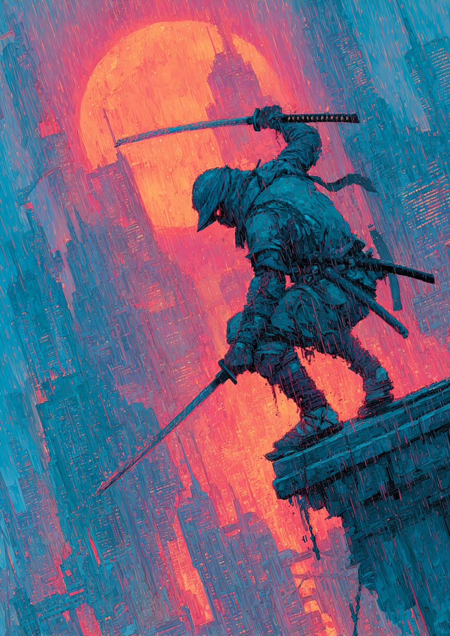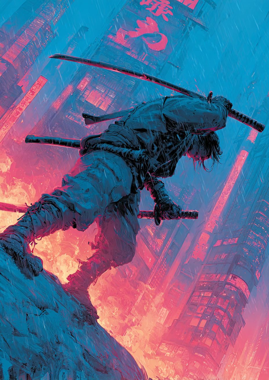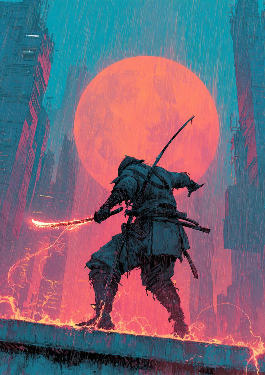 A futuristic samurai dueling on a neon-lit rooftop, katana sparking with electric energy, rain-soaked cityscape with towering holograms, dynamic action scene, cyberpunk aesthetic, hyper-detailed, vibrant blues and pinks --ar 5:7 --v 7.0 --s 750