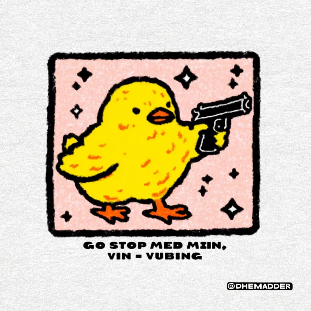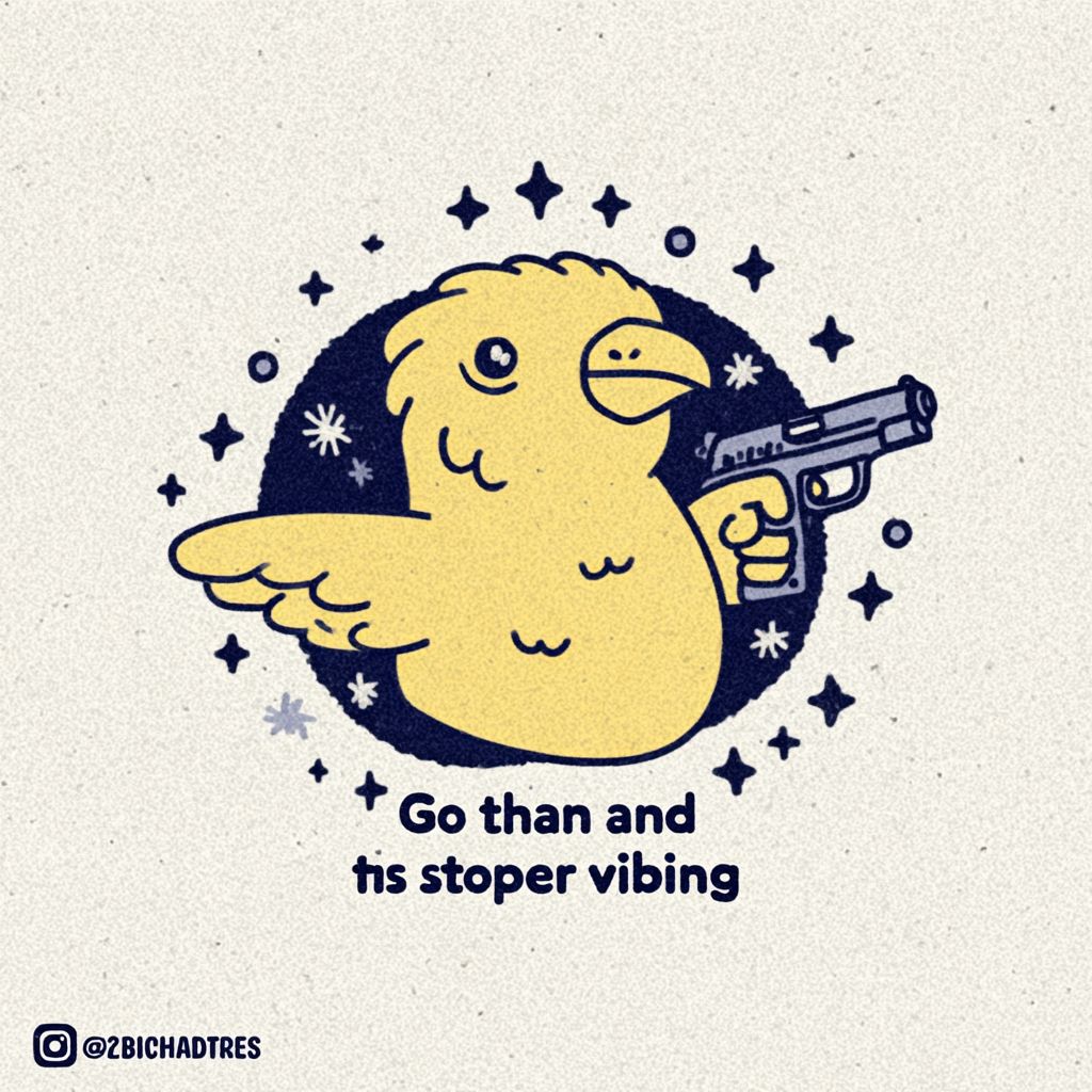 رسم توضيحي جريء ومضحك يت featuring طائر كرتوني سمين ولونه أصفر زاهي، محاط بخطوط سوداء سميكة، ممسكًا بمسدس أسود صغير موجهًا للخارج بجناحه، ومحاطًا برموز نجوم سوداء مبعثرة وزوايا حدودية تشبه التخطيطات الخشنة، كلها على خلفية بيضاء كريمية مزخرفة؛ أسفل الطائر، بتعليق شفهي بالأحرف السوداء، مكتوب النص "امضي قدما، حاول أن توقفني عن الاهتزاز،" مما يعكس مزاجًا تحديًا بشكل سخيف ولكنه خفيف بروح مرحة، بأسلوب فن مستوحى من الميمات يشبه القصص المصورة العصي على احترامها من الإنترنت.