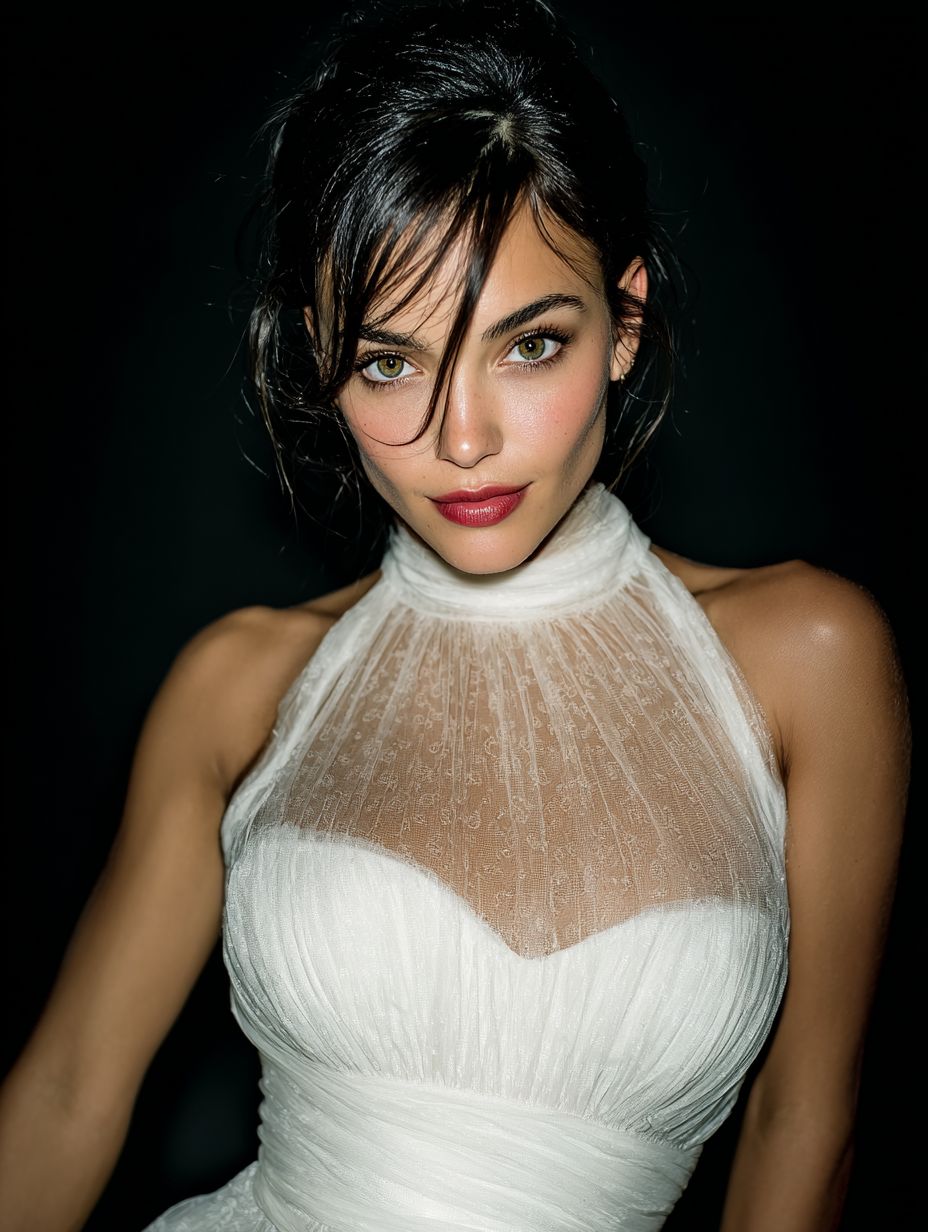 A stunning 23-year-old Italian woman with sharp Mediterranean features--olive skin, dark expressive eyes, and full lips--wearing an elegant white Valentino dress (3/4 body shot). The dress is impeccably tailored, with delicate e, chiffon layers, or minimalist couture draping, exuding effortless luxury. She stands in a relaxed yet poised pose, one hand lightly resting on her hip, the other draped gracefully at her side. The background is deep matte black, amplifying the dress’s brilliance. Her hair is in a sleek low bun with face-framing tendrils, or in voluminous old-Hollywood waves. Makeup is refined: glowing skin, defined brows, and a muted red lip. The lighting is soft but sculptural, highlighting her bone structure and the dress’s texture. The vibe is *Italian aristocracy meets modern chic*--timeless, confident, and utterly captivating.* Key Details: - Framing: 3/4 shot (mid-thigh upwards). - Face: Classic Italian beauty--strong nose, almond eyes, radiant complexion. - Dress: Valentino’s signature sophistication (mention *Roman stud details* or *tulle accents* if desired). - Pose: Shoulders back, chin slightly lifted, exuding quiet confidence. - Extras: Diamond stud earrings, a single delicate bracelet--nothing distracting. Perfect for high-fashion editorials or luxury brand visuals --ar 3:4 --raw --s 750
