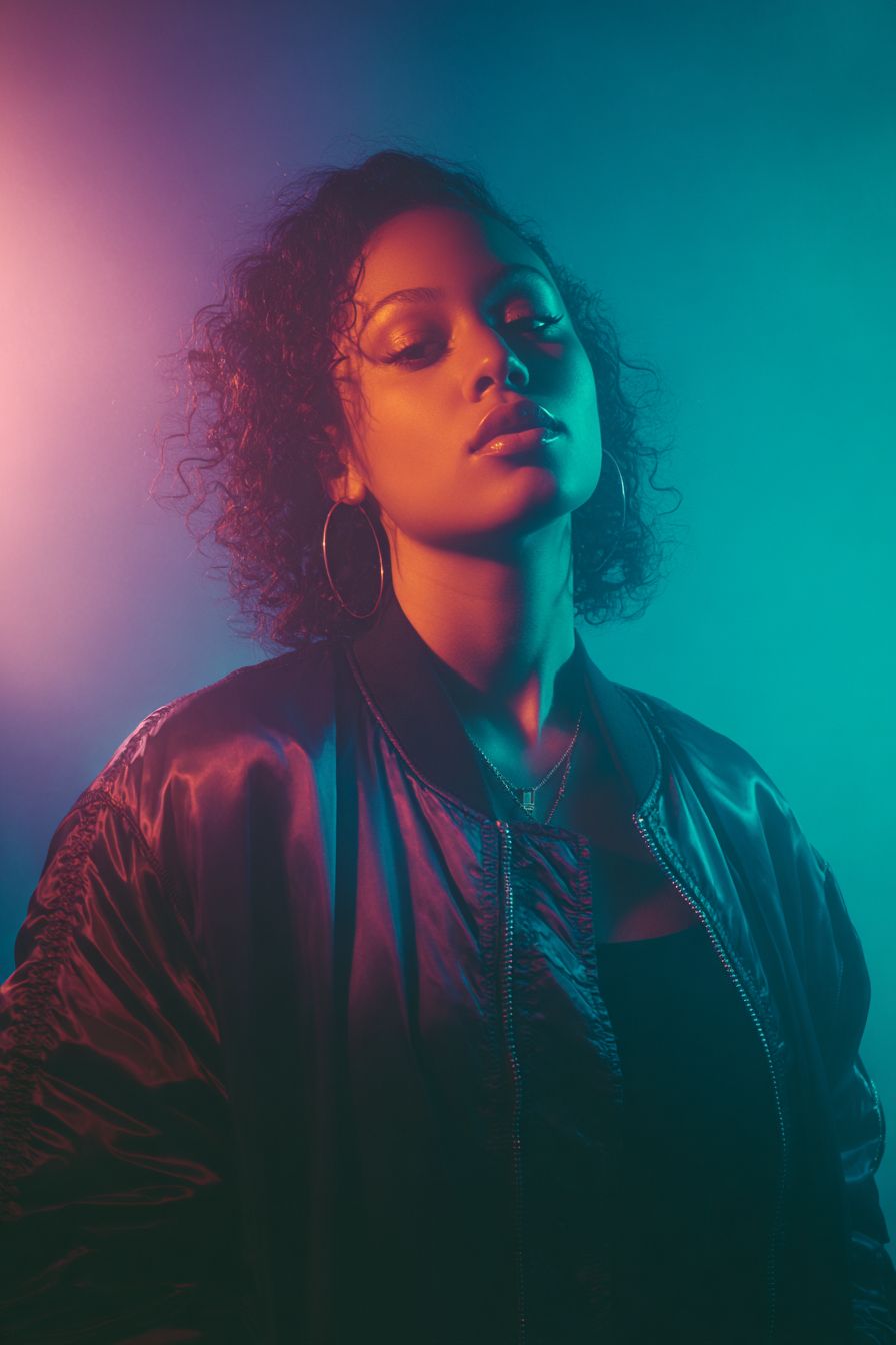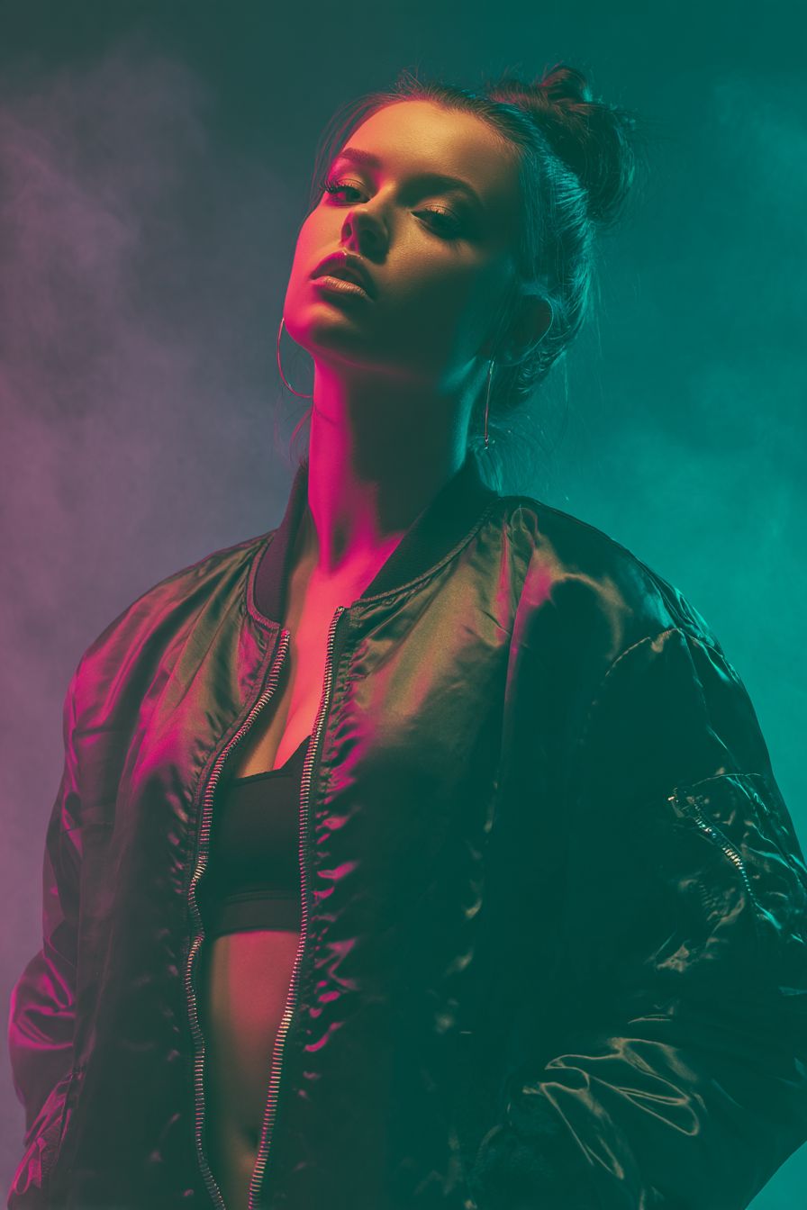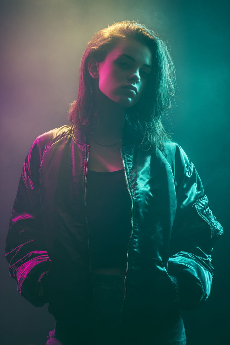 studio portrait of female DJ wearing satin bomber jacket, split lighting with teal gel from camera-right and magenta gel from camera-left, thin haze for light scatter, 50 mm f/1.2 lens, smoky atmosphere, cinematic neo-noir mood. Negative Prompt: text overlays, lens flare streaks, watermark. --ar 2:3 --v 7.0