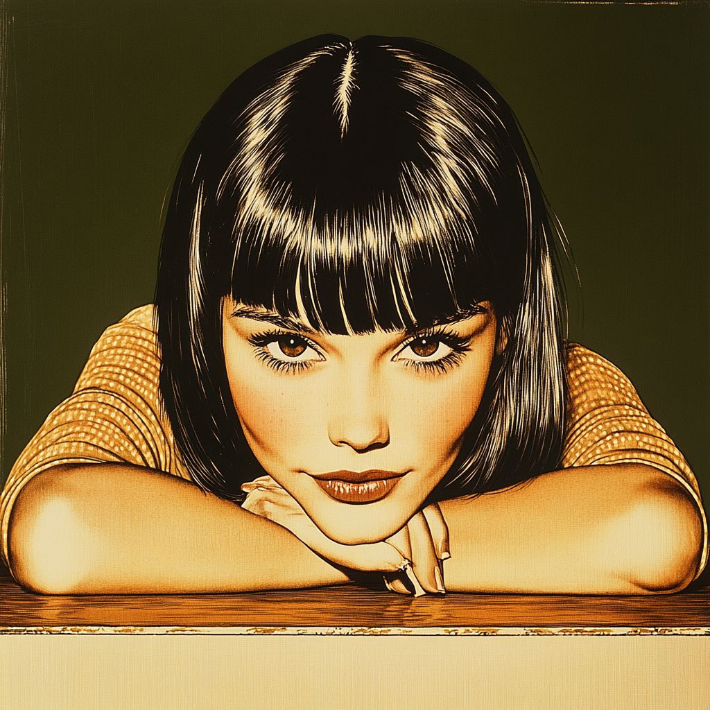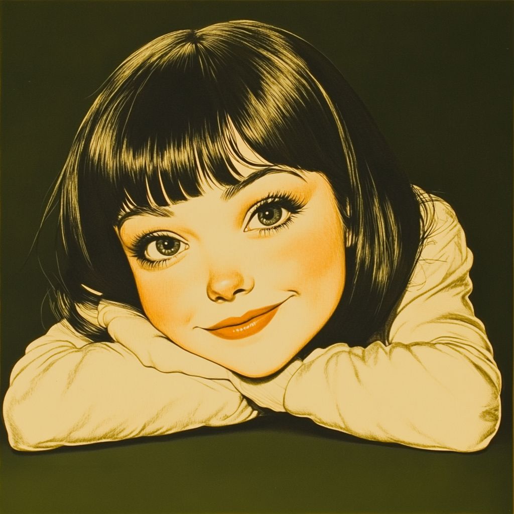 لوحة كرتونية لطيفة لامرأة شابة مبهجة بشعر أسود وغرة، عيونها كبيرة جدًا، والكثير من البياض، وبؤبؤ أسود صغير جدًا، وعيونها مرفوعة قليلاً. جالسة على طاولة، تنظر إلى أسفل إلى خلفية داكنة خضراء.