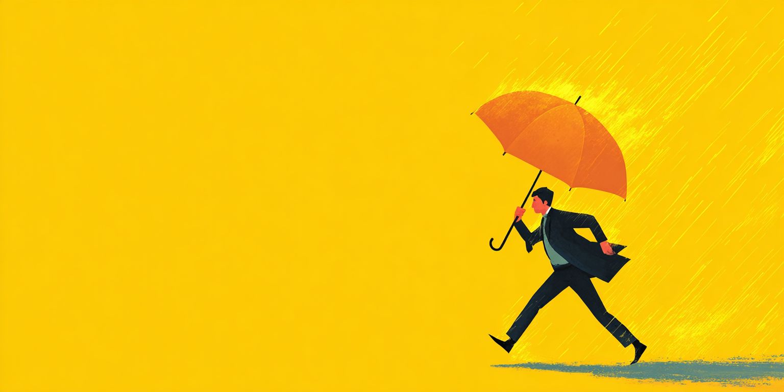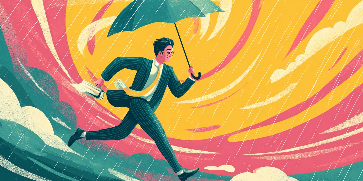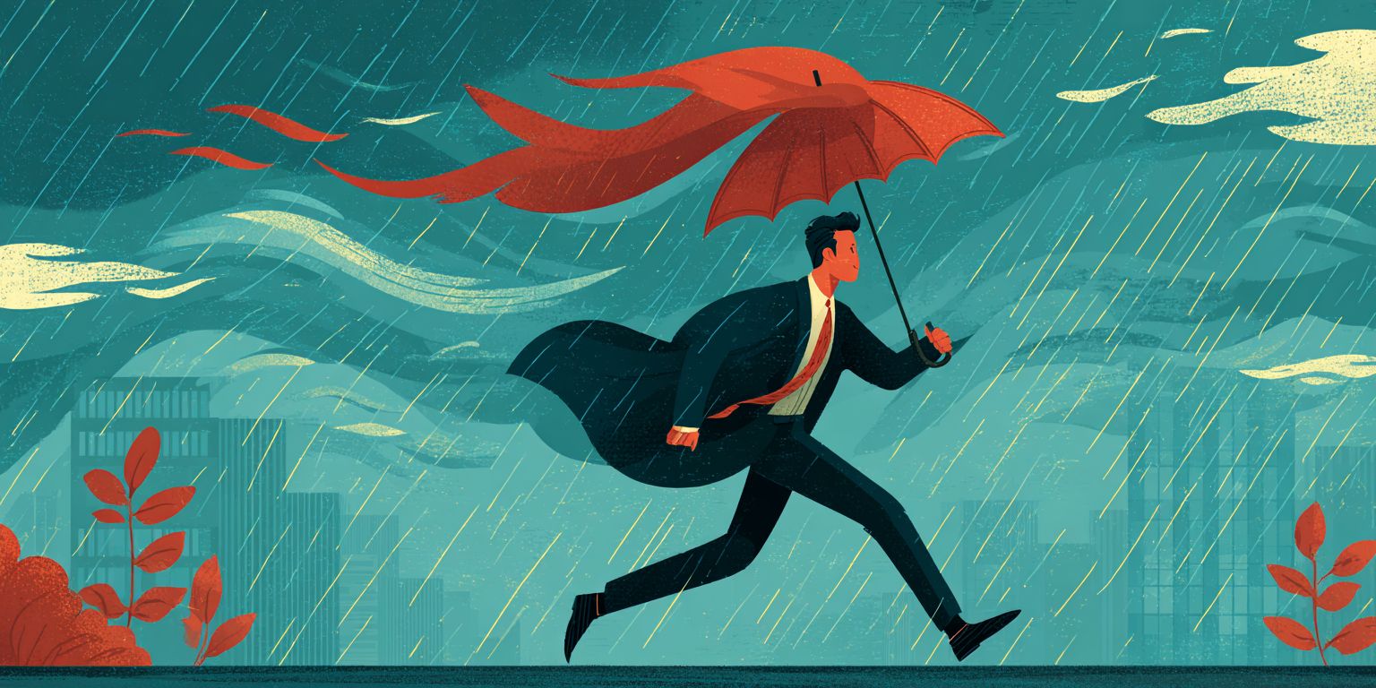 رجل أعمال آسيوي شاب يسير بصعوبة في الرياح والمطر ممسكا بالمظلة