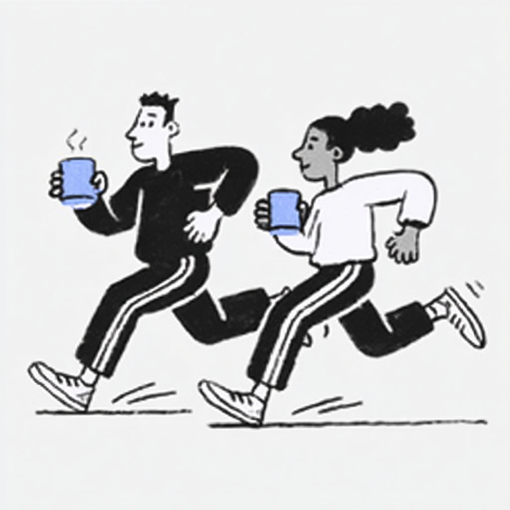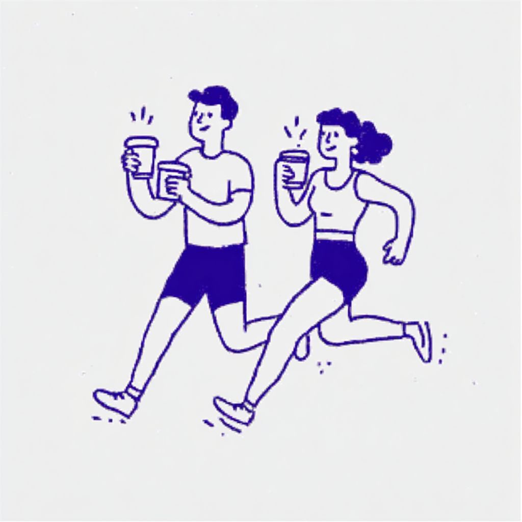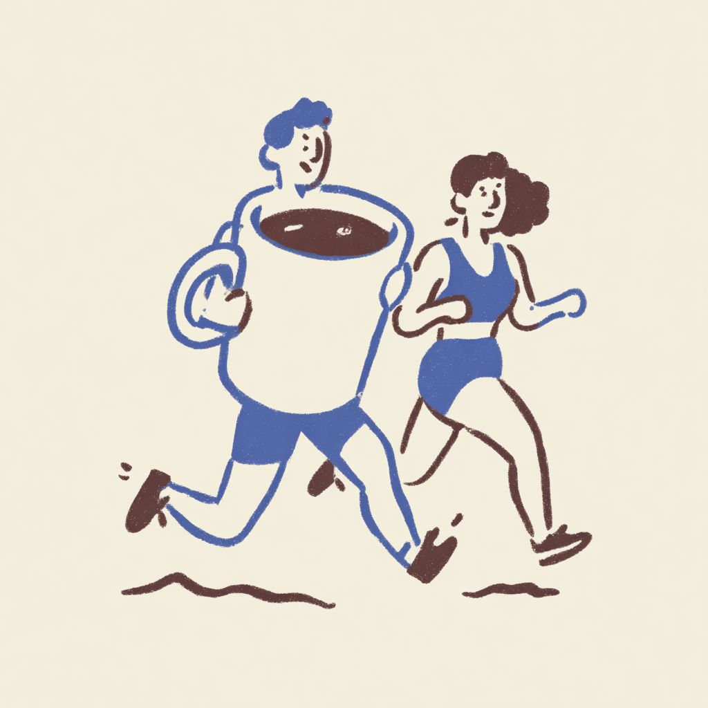 رسمة توضيحية بأسلوب متجرد. رجل وامرأة عداؤان، يرتديان ملابس جري. كلاهما يحمل كوب قهوة كبير أمام أجسادهما. إنهما يركضان.