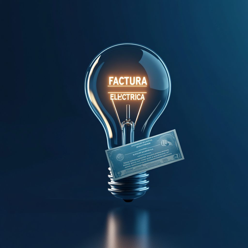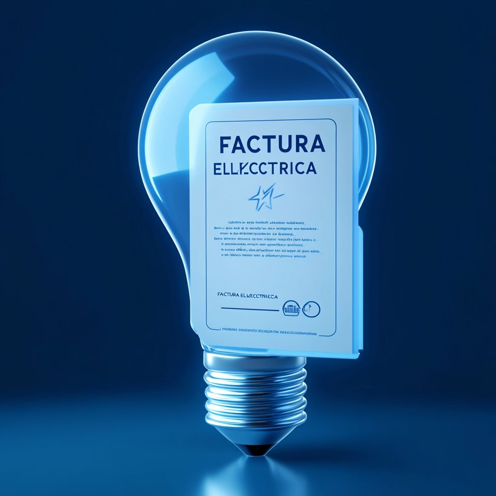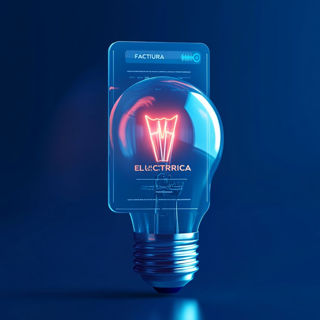 صورة توضيحية بأسلوب أيقوني ثلاثي الأبعاد لمصباح مضيء مع فاتورة الكهرباء العائمة المميزة بـ'FACTURA ELÉCTRICA'، وكلاهما مصممان من مواد بلاستيكية نظيفة وناعمة مع ظلال ناعمة وإضاءة حديثة. الخلفية عبارة عن لون أزرق عميق موحد (#0052a4). التصميم بسيط وأنيق ومصقول، ويشبه أيقونة واجهة المستخدم أو الصورة المرئية للتطبيق. يجب أن تحتوي المشهد على انعكاسات ناعمة، وظل بيئي لطيف، وتوهج حجمي معتدل من المصباح. لا يوجد نص خارج الفاتورة. لا توجد عناصر بشرية. تركيبة مركزة.