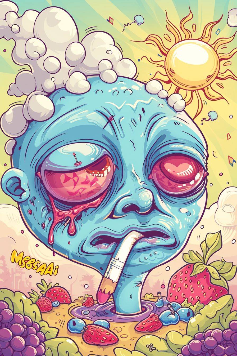 à cartoon blue tired face smoking with red tired eyes, a sun in the corner , fruit on the bottom and cartoon rainbow letters who says " MusesAi", the face take the full image size --ar 2:3 --v 6