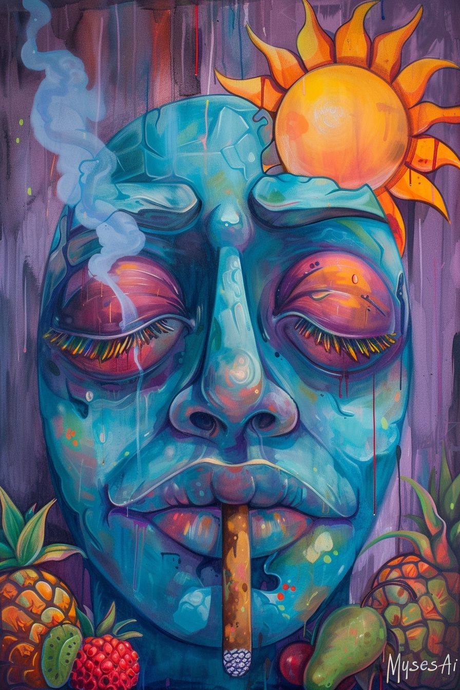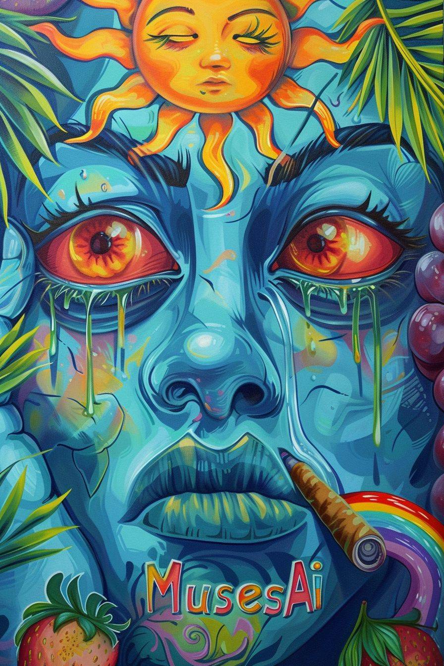 وجه كرتوني أزرق متعب يدخن بعيون حمراء متعبة، وشمس في الزاوية، وفواكه في الأسفل، وحروف قوس قزح كرتونية تقول "MusesAi"، الوجه يأخذ حجم الصورة بالكامل.