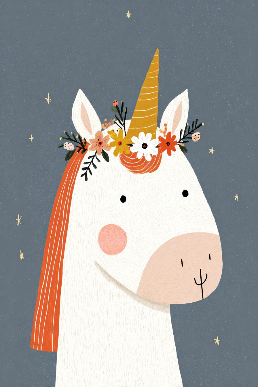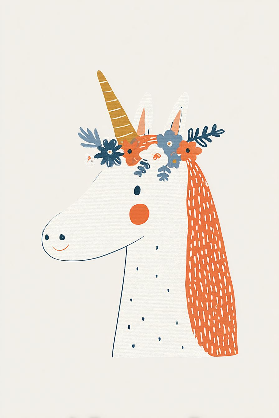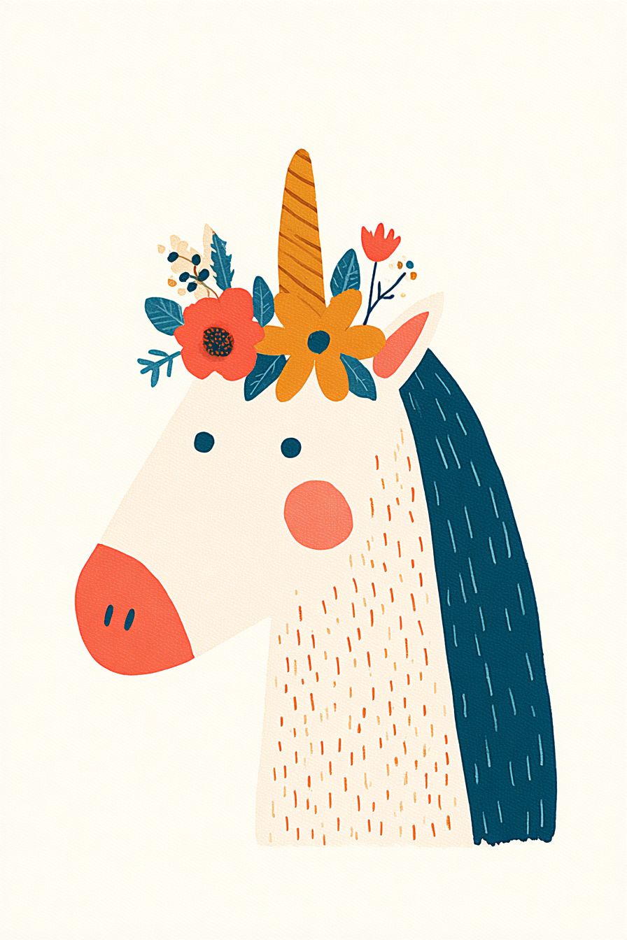 رأس وحيد القرن مزين بتاج من الزهور بأسلوب فن الجدران للروضة