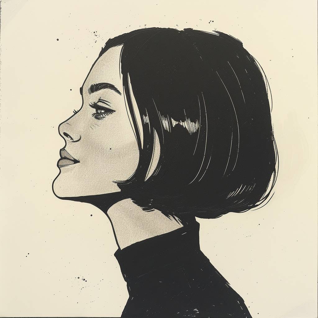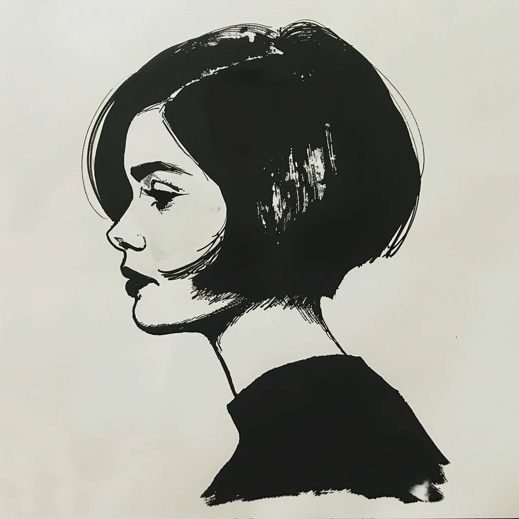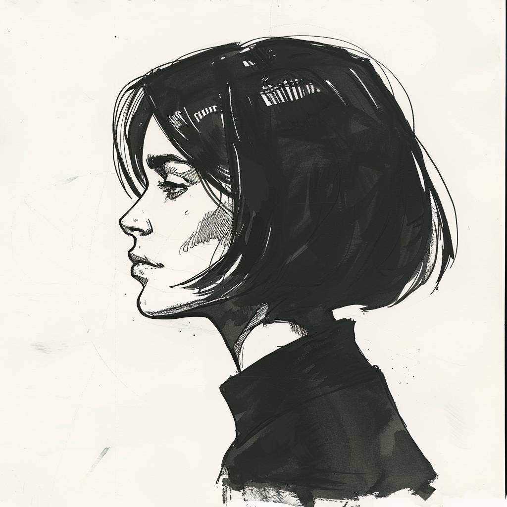 صورة كاريكاتورية بأسلوب فن الحبر السائل الأحادي اللون، عرض جانبي، تعبر عن قصة شعر بوب هادئة.
