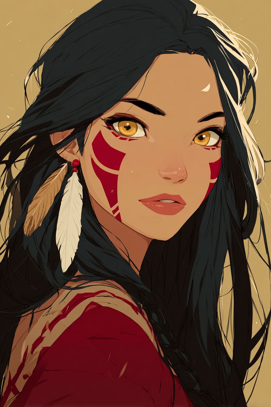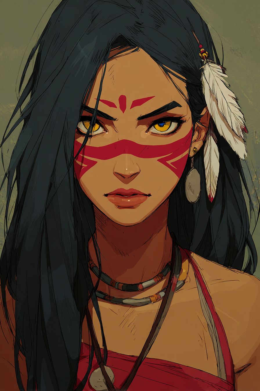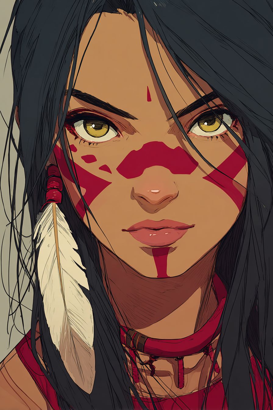 رسم شخصية بأسلوب مانغا لامرأة جميلة ذات شعر أسود طويل وخيوط بيضاء دقيقة، وعيون صفراء زاهية، وتاتو وجه مميز مستوحى من القبائل باللون الأحمر. تحمل ملامح مستوحاة من الشعوب الأصلية، ترتدي إكسسوار شعر يحمل ريشة واحدة، وبشرتها ذات لون بني أحمر دافئ.