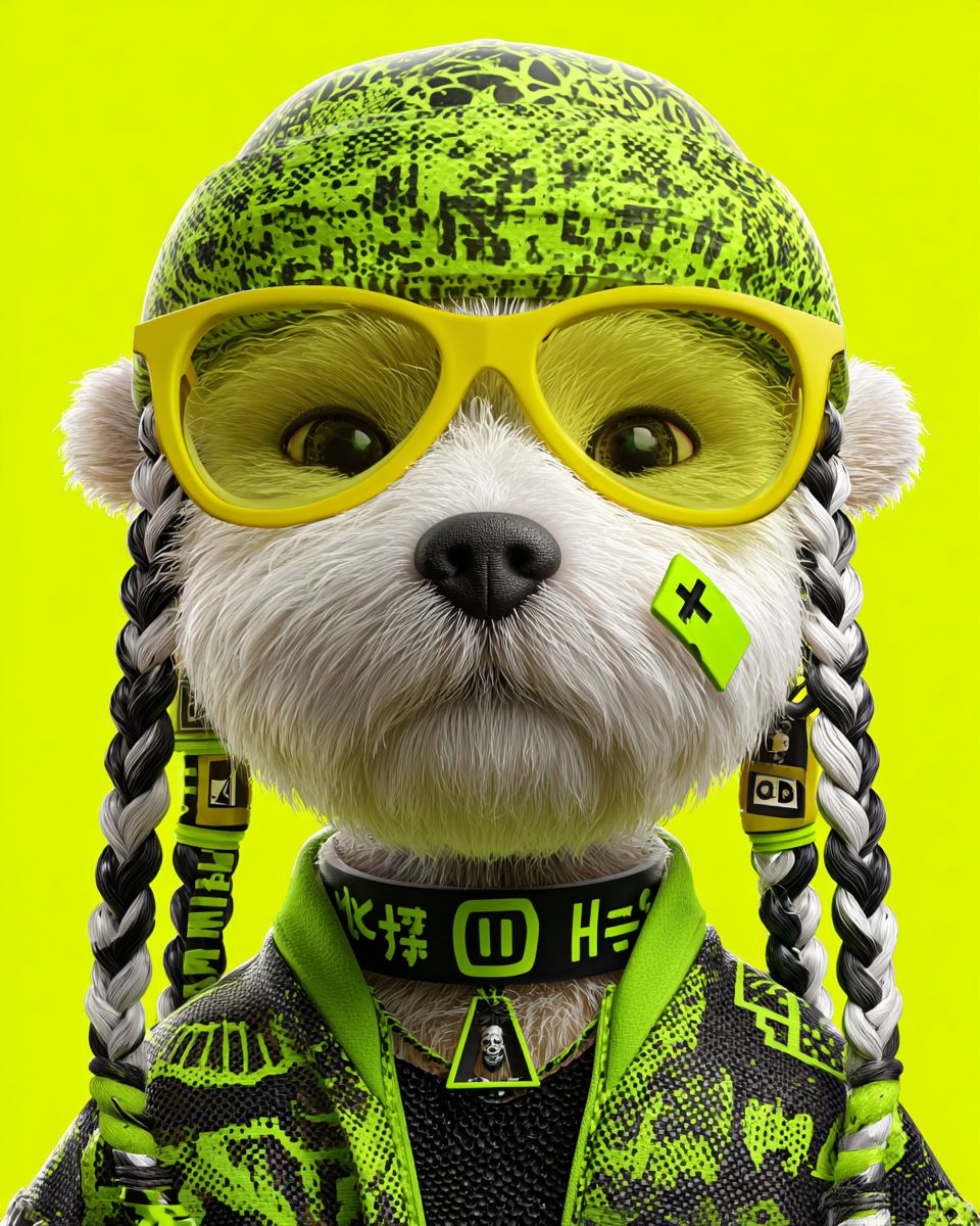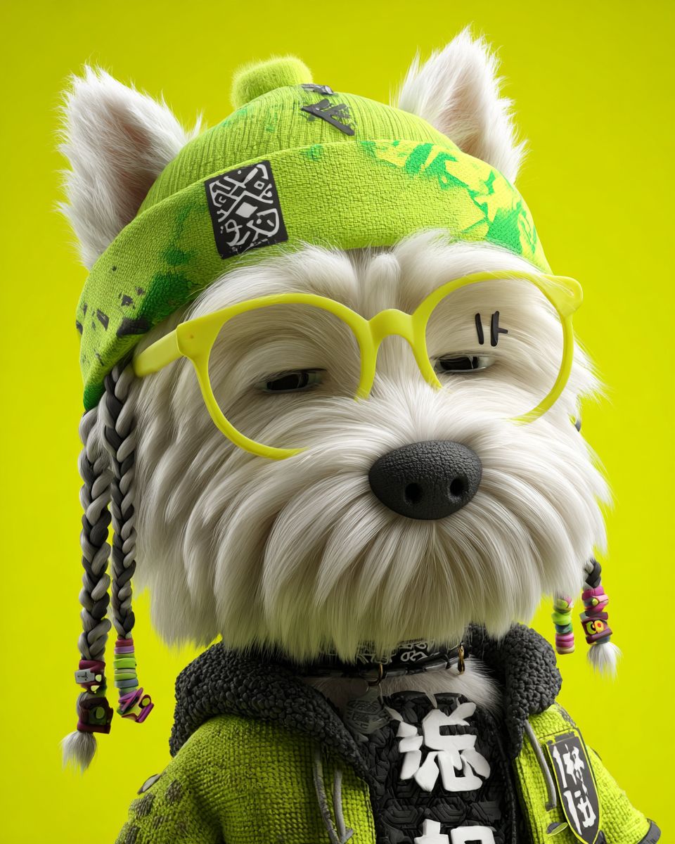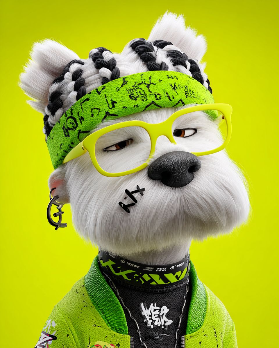 كلب ترير ويست هايلاند الأبيض ثلاثي الأبعاد بأسلوب بونك عصري، ذو شعر مضفر مزدوج مقلية بالألوان الفضية والسوداء؛ يرتدي قبعة خضراء فلورية ذات نقوش؛ يرتدي نظارات دائرية صفراء، وبقع سوداء على وجهه، ولصقة خضراء على أحد الخدين، ورموز صغيرة سوداء على الجلد؛ يرتدي أقراطاً مبالغ فيها بأسلوب البونك تحمل عناصر باللغة الإنجليزية ورموز أخرى؛ يرتدي سترة خضراء فلورية بتصميم معتم ذو نسيج داكن، ويحيط بقبته طوق أسود مزين بأحرف إنجليزية بيضاء، مثل تلك الخاصة بالصندوق الضوئي؛ الخلفية العامة باللون الأصفر الزاهي، مما يخلق تأثيرًا عصريًا وشخصيًا ذو أثر بصري قوي. شخصيات بأسلوب الرسوم المتحركة من بيكسار، دقة عالية.
