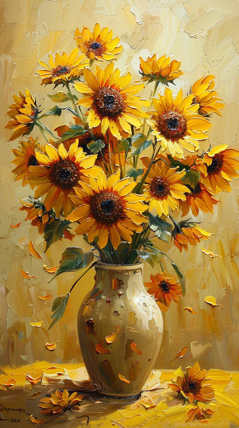 لوحة جميلة لزهور دوار الشمس بأسلوب فنسنت فان جوخ، مع خلفية صفراء ووعاء مليء برؤوس دوار الشمس. تحتوي بتلات الزهرة على ظلال من الأحمر الداكن، البني المائل إلى الأصفر، إلى البرتقالي الفاتح، بينما تُظهر مراكزها علامات الفتح أو الإغلاق. لوحة زيتية مكثفة، بأسلوب فنسنت فان جوخ، عدد قليل من زهور دوار الشمس، إناء بسيط، مفرش طاولة أصفر نظيف، براعم وزهور متفتحة، بتلات صفراء تقليدية أو بنية داكنة أو بيضاء مائلة إلى الصفرة، سيقان خضراء وبنية، ضوء الظهر القوي، خلفية زرقاء مشوشة قليلاً، بأسلوب مونيه، دقة عالية.